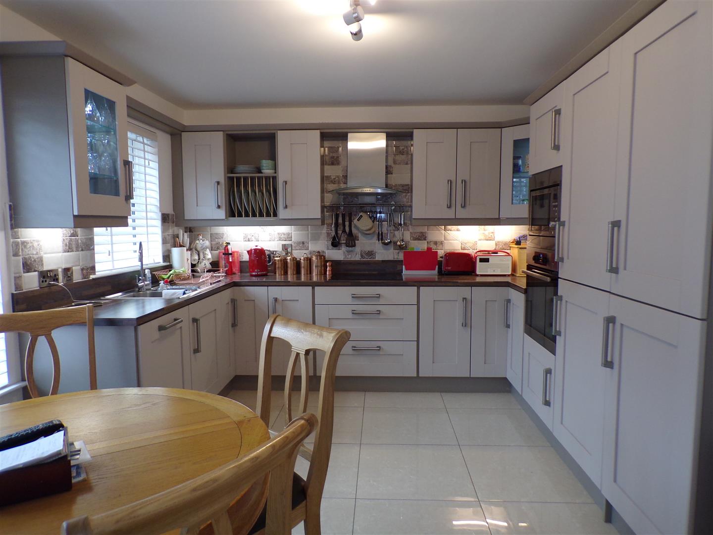 Having excellent range of eye and low level units, tiling between units, concealed lighting under units, 1 1/2 bowl stainless steel sink unit with mixer taps, stainless steel extractor hood hob, oven, microwave, integrated fridge/freezer and dishwasher, tiled floor, dining space.
