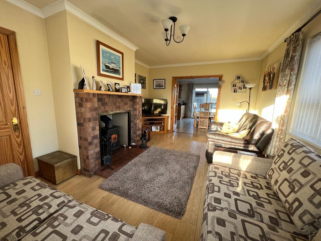 Ceiling cornicing; multi fuel stove set in brick surround; tiled hearth; laminate wooden floor; double Georgian glazed doors to:-