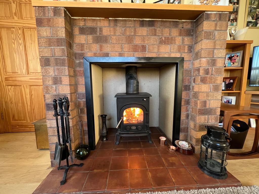 Having attractive fireplace with cast iron inset and granite hearth
