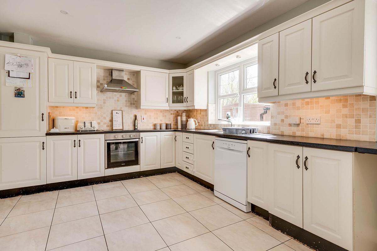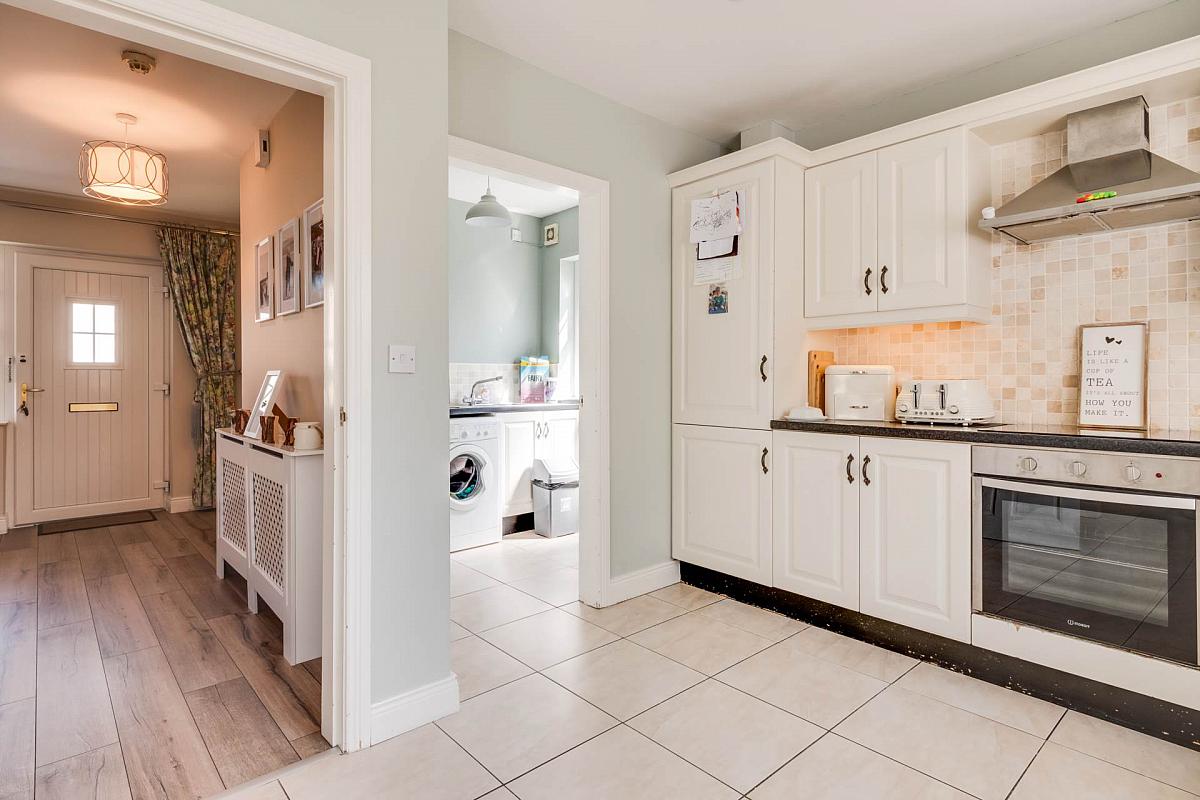 Fitted kitchen with a range of high and low level units, integrated hob, oven & grill, fridge freezer, stainless steel extractor fan hob, plumbed for washing machine, tiled floor & splash back, breakfast bar, recessed lighting, built in storage cupboard.