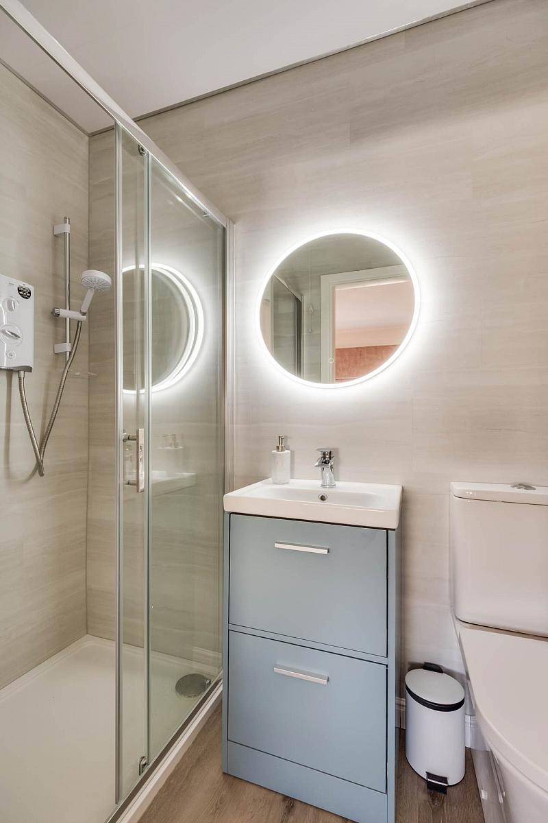 White contemporary suite, step in shower cubicle, electric shower, vanity unit, heated towel rail, protective wall cladding & laminate flooring.
