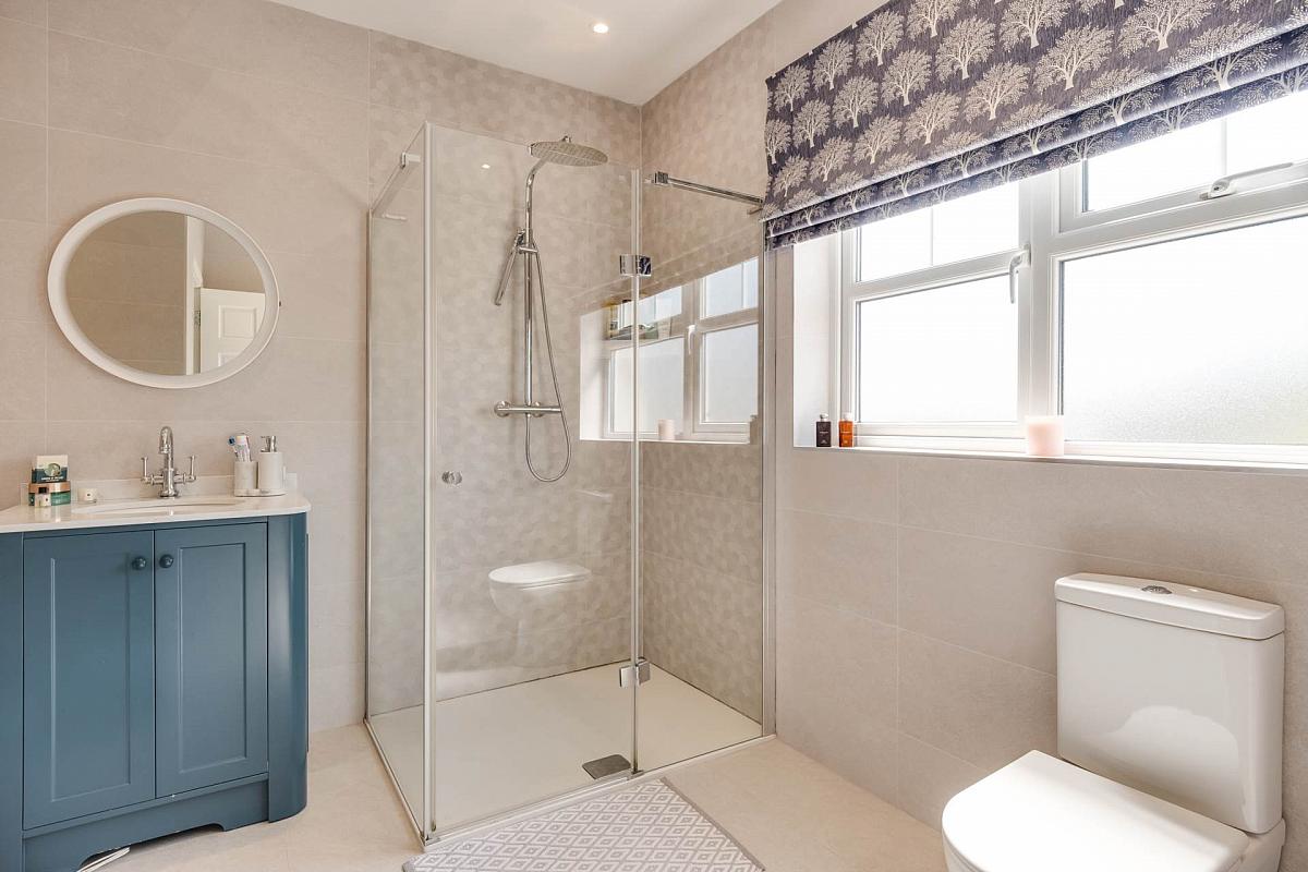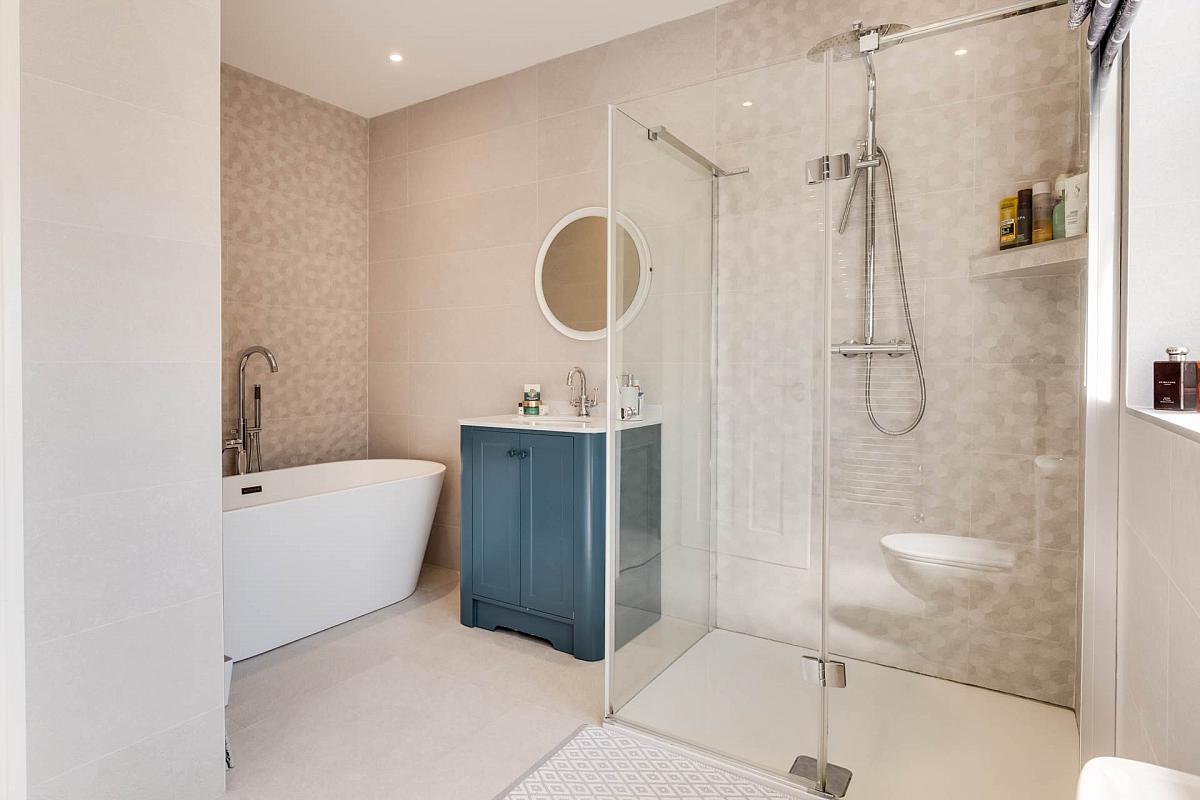 (10'11' x 5'7' & 6' x 4'11') Contemporary suite with feature bath, step in shower cubicle with thermostatically controlled shower, vanity unit, fully tiled walls with feature walls, tiled floor, recessed lighting, heated towel rail.