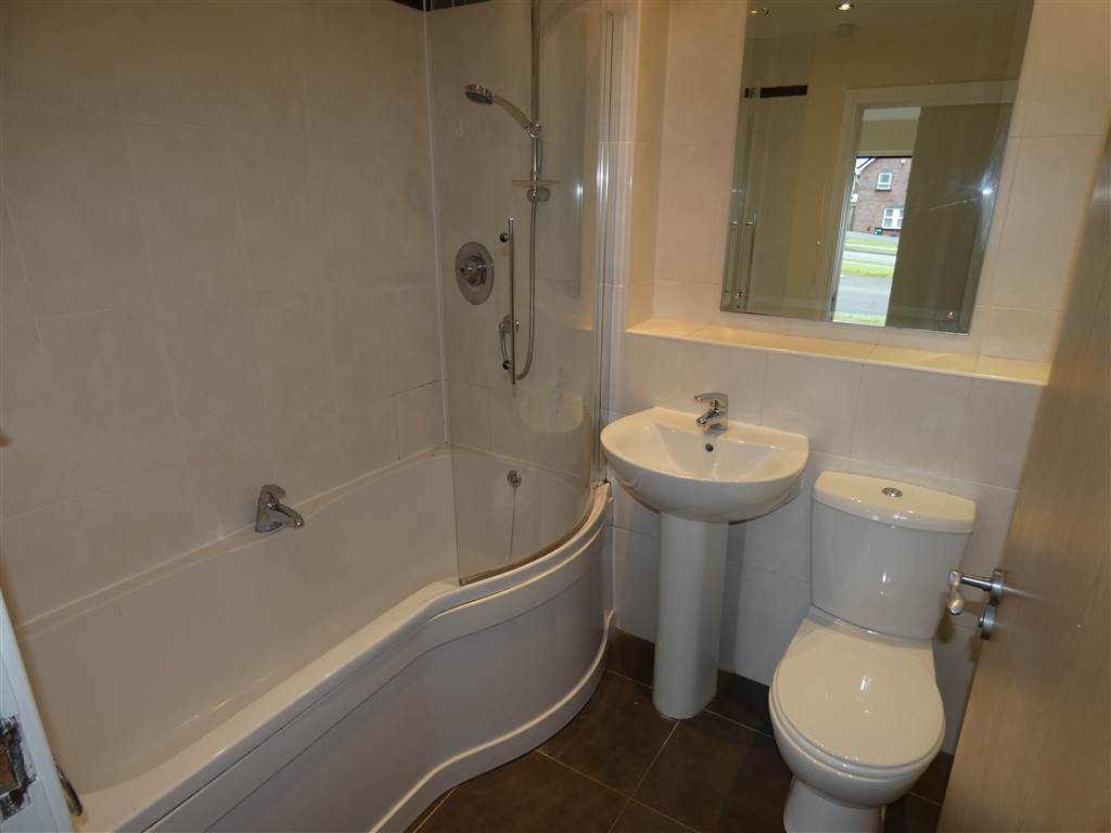 Contemporary white suite comprising panelled bath with thermostatically controlled shower and glazed screen over, pedestal wash hand basin, close coupled w.c., partially tiled walls, ceramic tiled floor, extractor fan.