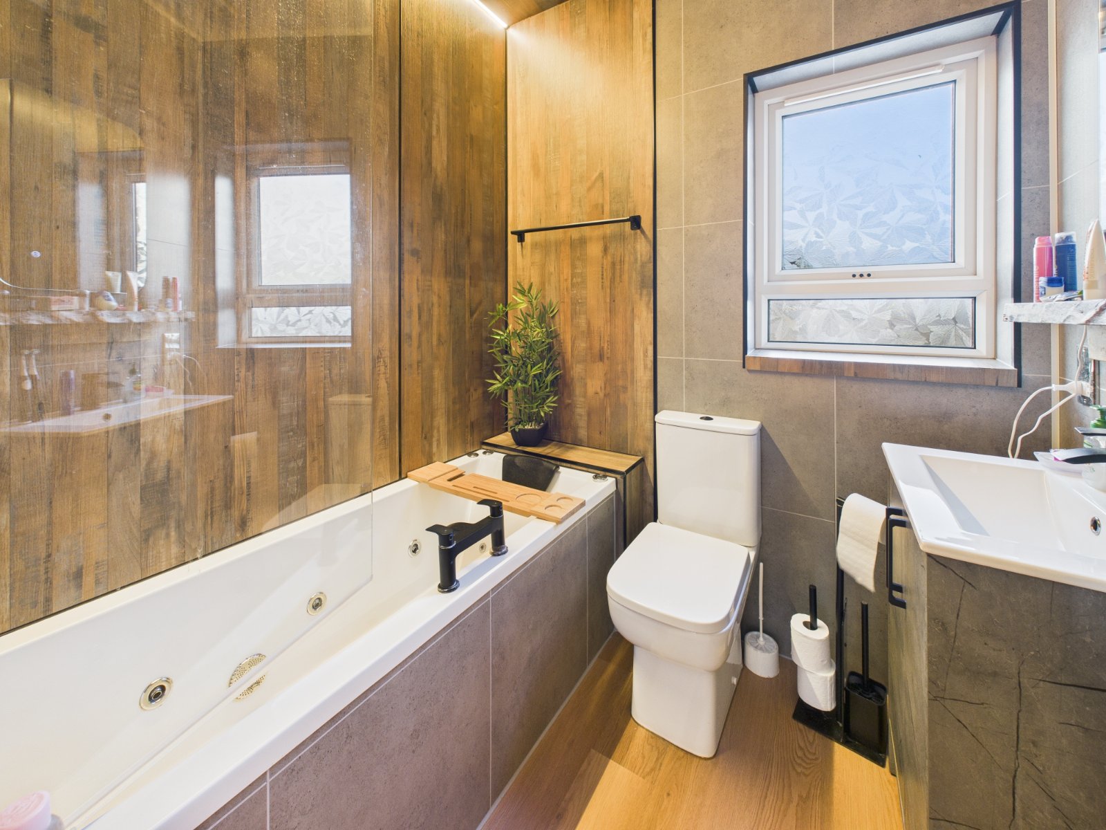 Modern three piece bathroom suite comprising tiled Jacuzzi style bath with mains shower overhead, low flush WC and wall mounted wash hand basin. Bespoke wooden feature splashbacks. Tiled walls and laminate floor. Large heated towel rail.