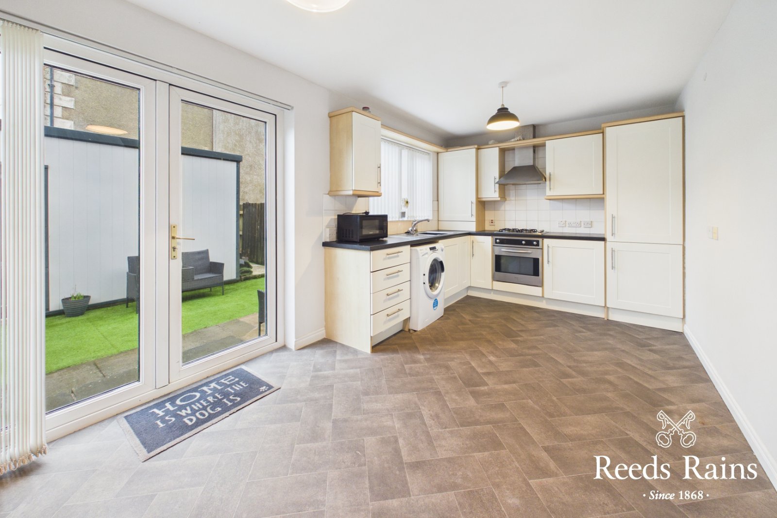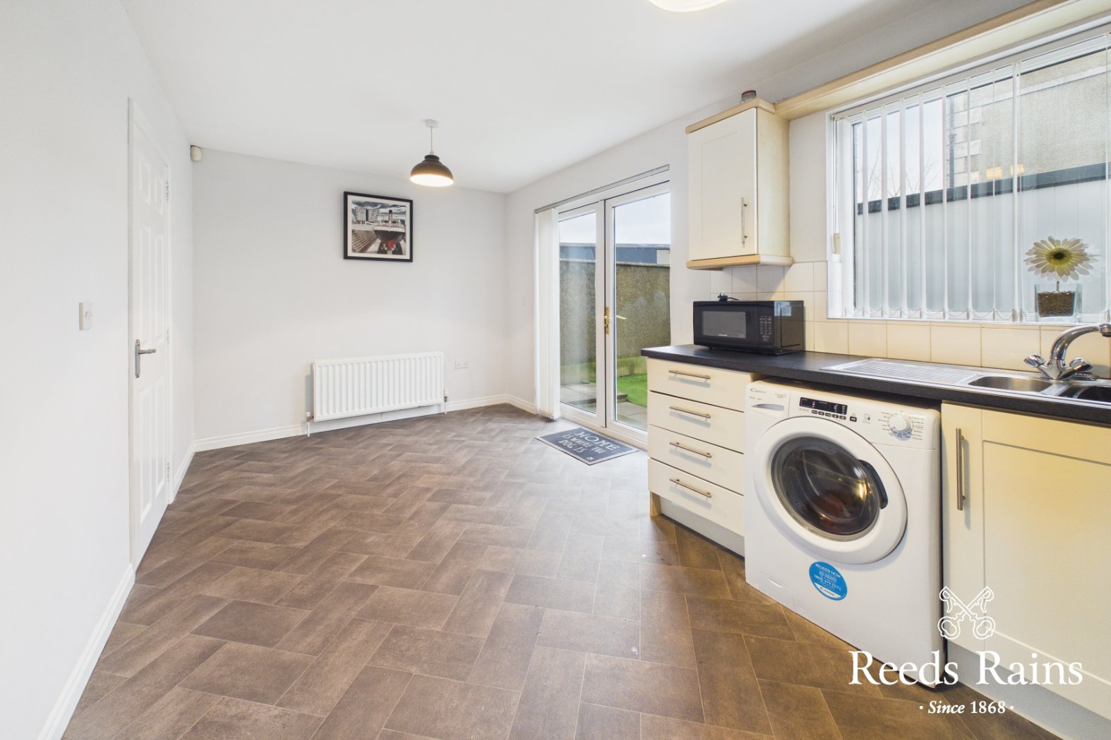 Superb range of high and low level units with complimentary worktops. One and half bowl stainless steel sink and drainer unit. Built in electric oven, 4 ring gas hob and stainless steel extractor hood. Washing machine included. Space for fridge freezer. Tiled splash back to kitchen walls. Generous space allowing for an informal dining area. PVC double French patio doors leading to rear garden.