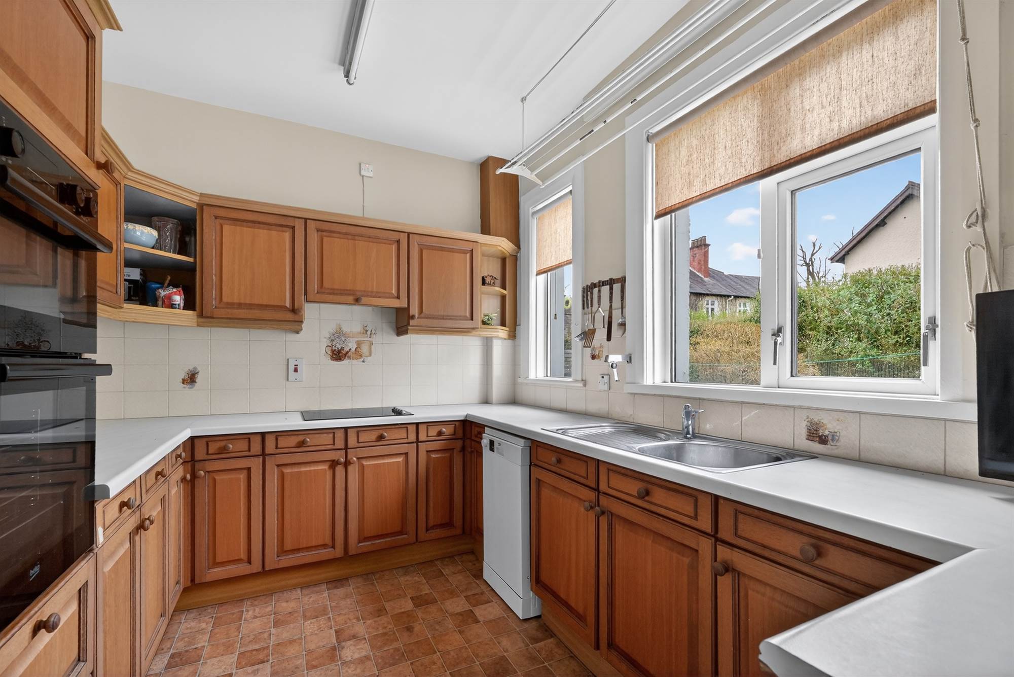 (at widest points). Range of high and low level units, work surfaces, single drainer stainless steel sink unit, integrated hob, integrated oven, space for fridge/freezer, plumbed for dishwasher, part tiled walls.