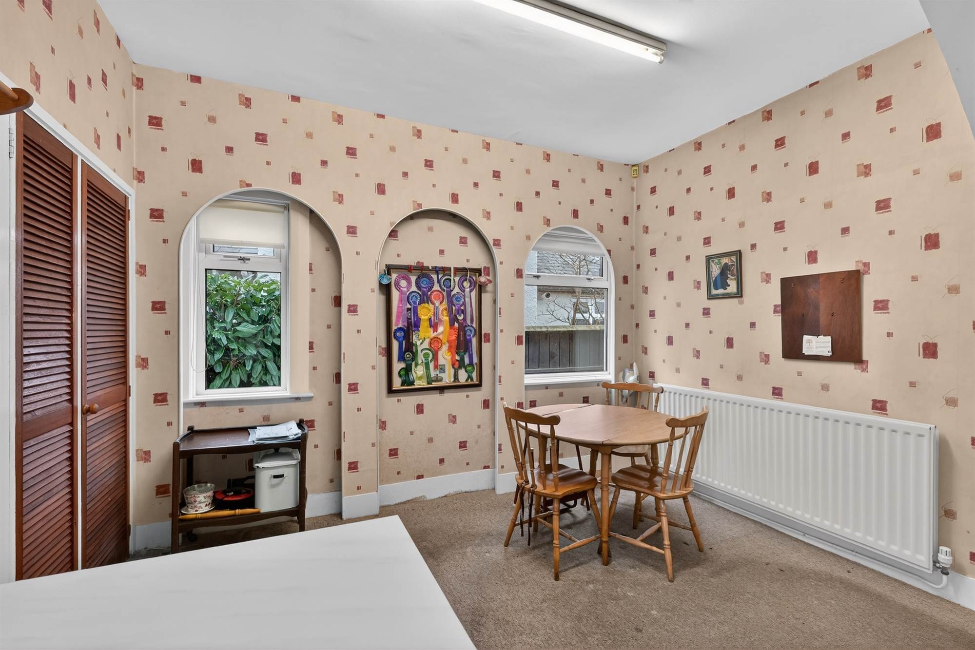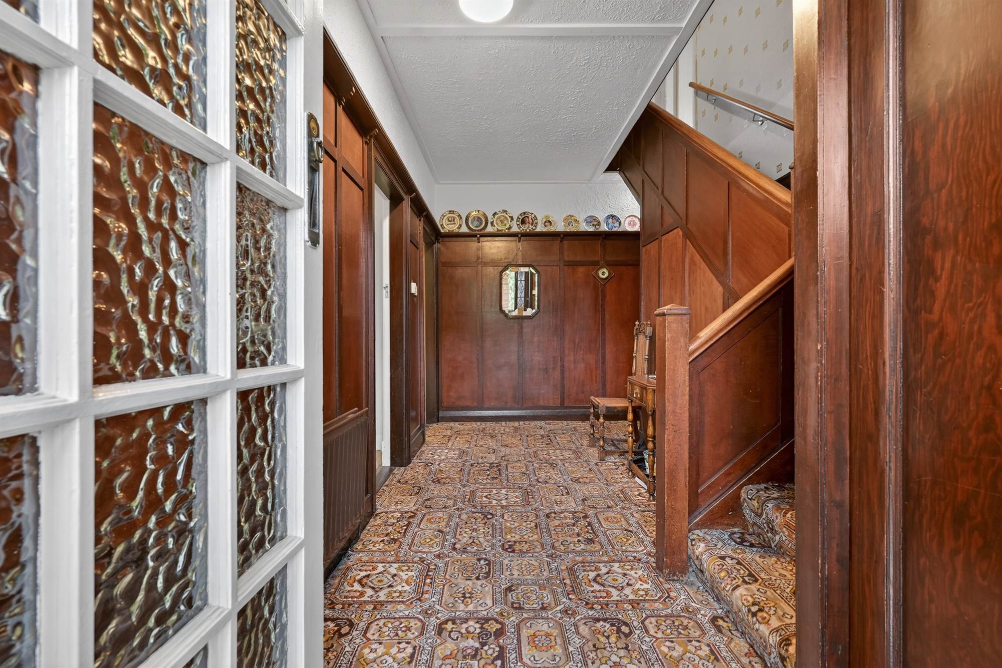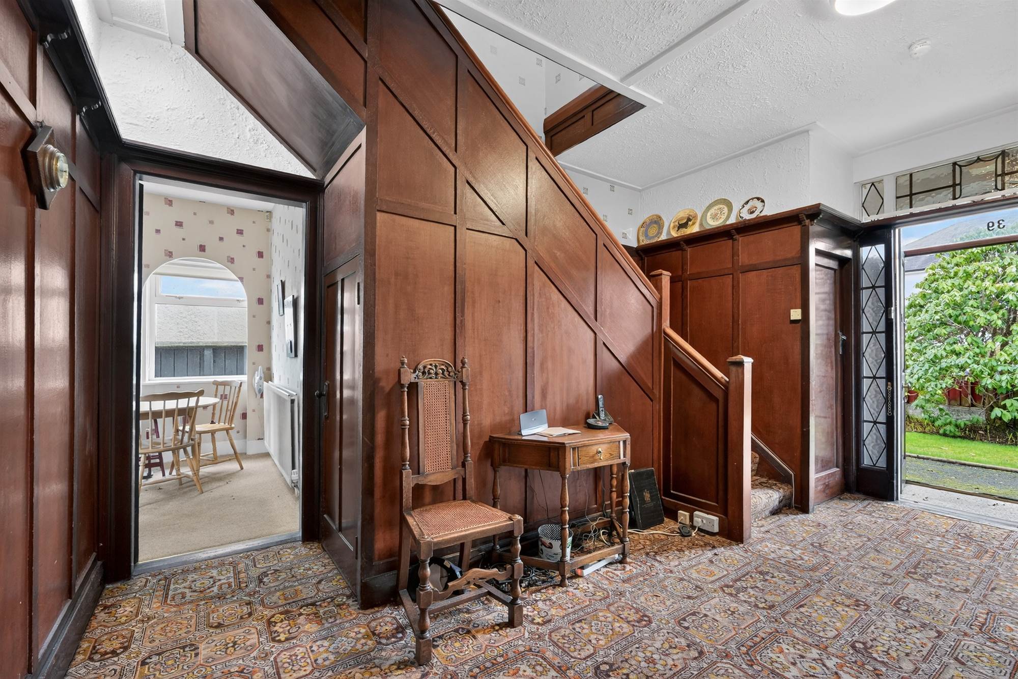 Part wood panelled walls and plate rack, cloakroom, under stairs storage.