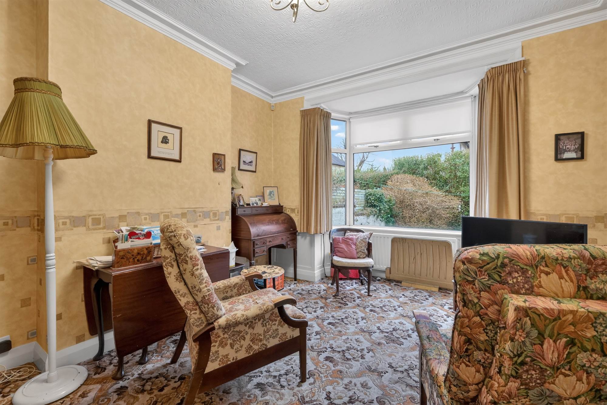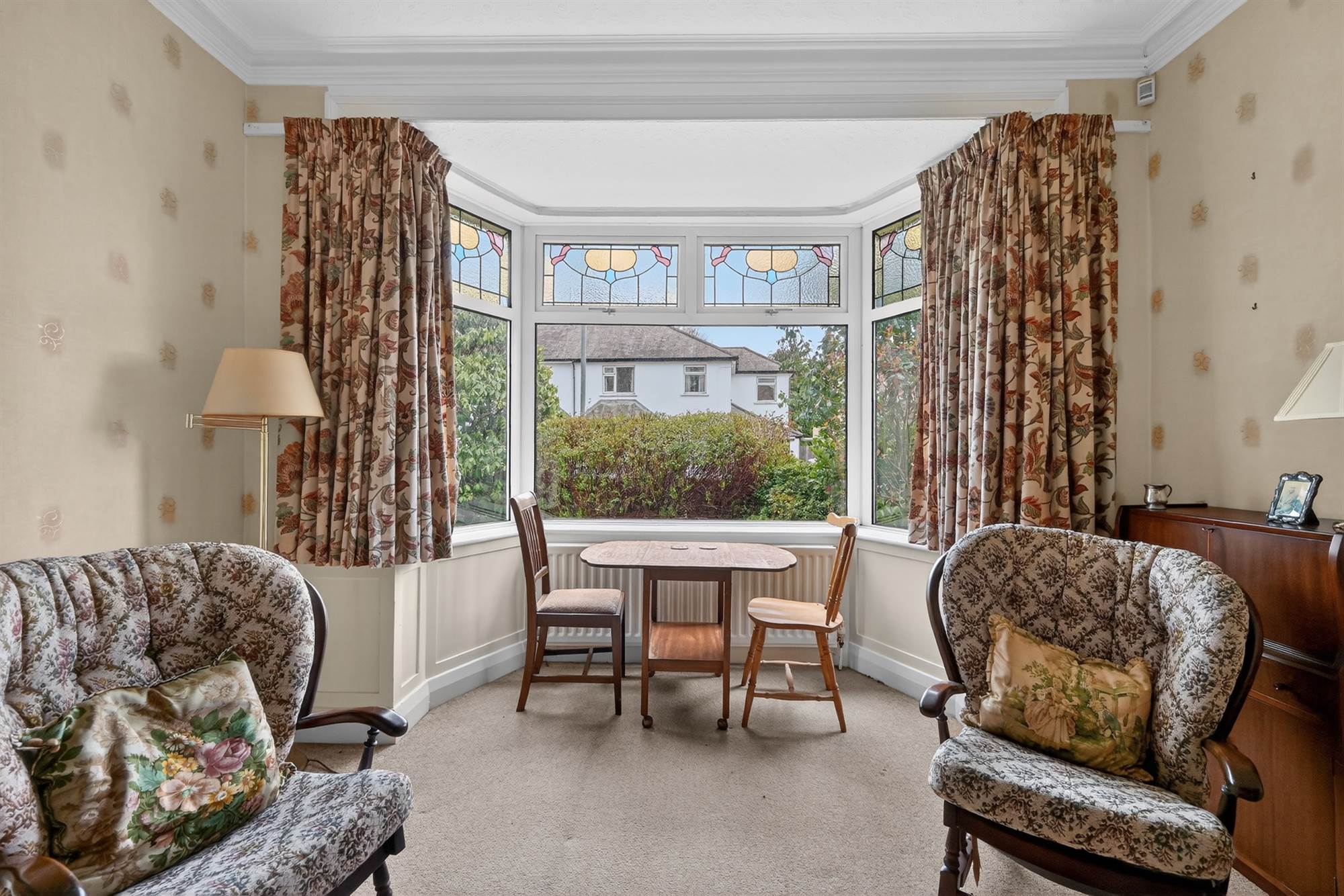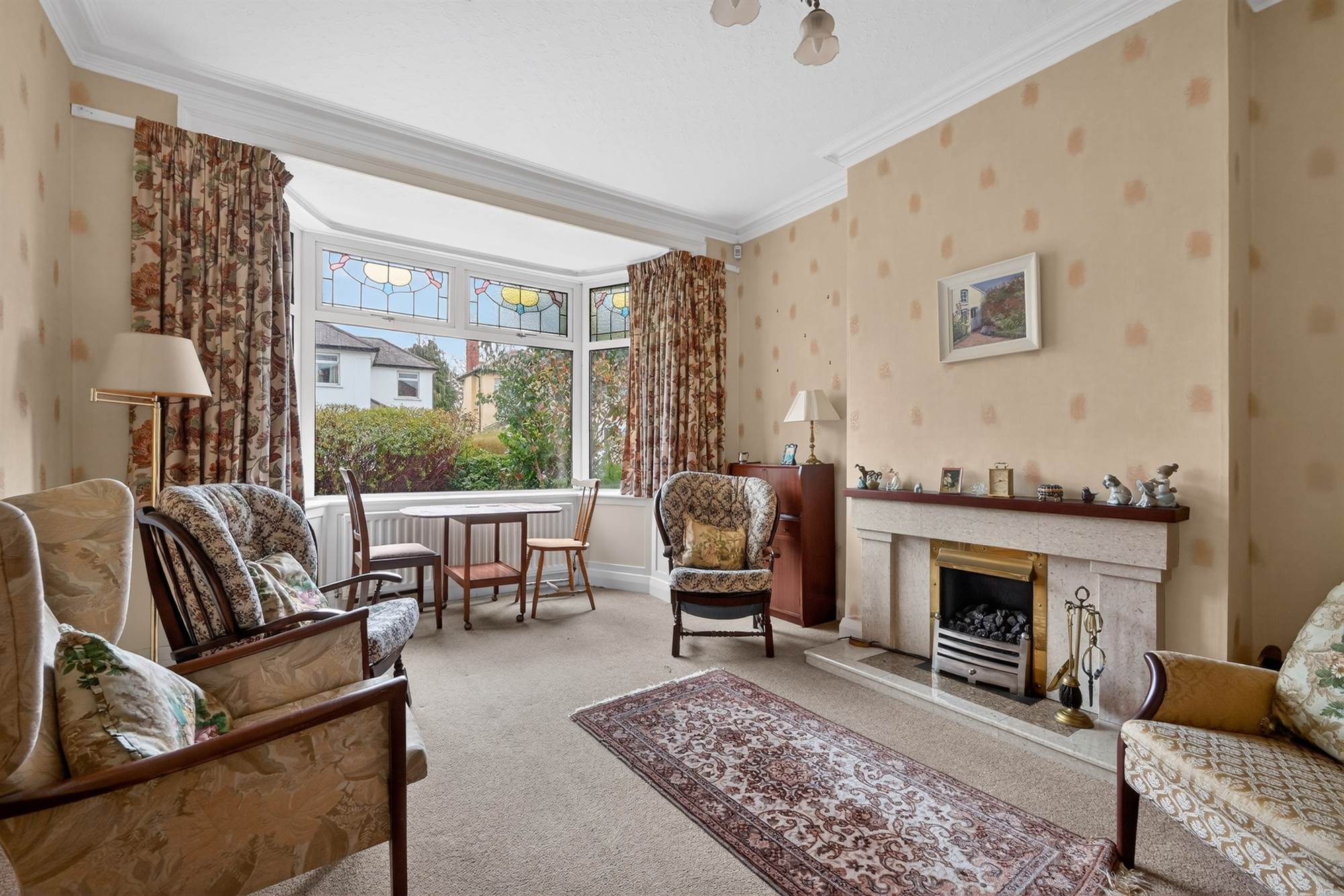 (at widest points). Marble fireplace with gas coal effect fire, wooden mantle, cornice ceiling, bay window, stained glass windows.