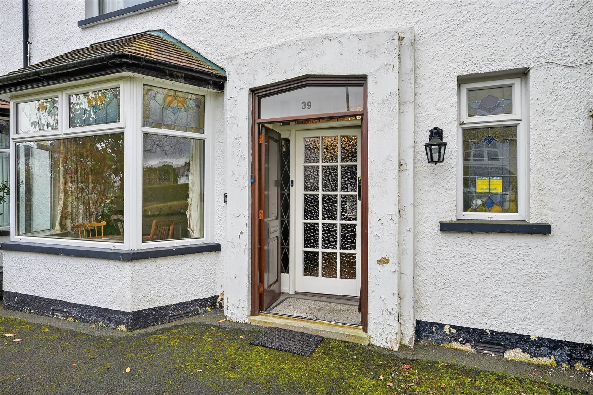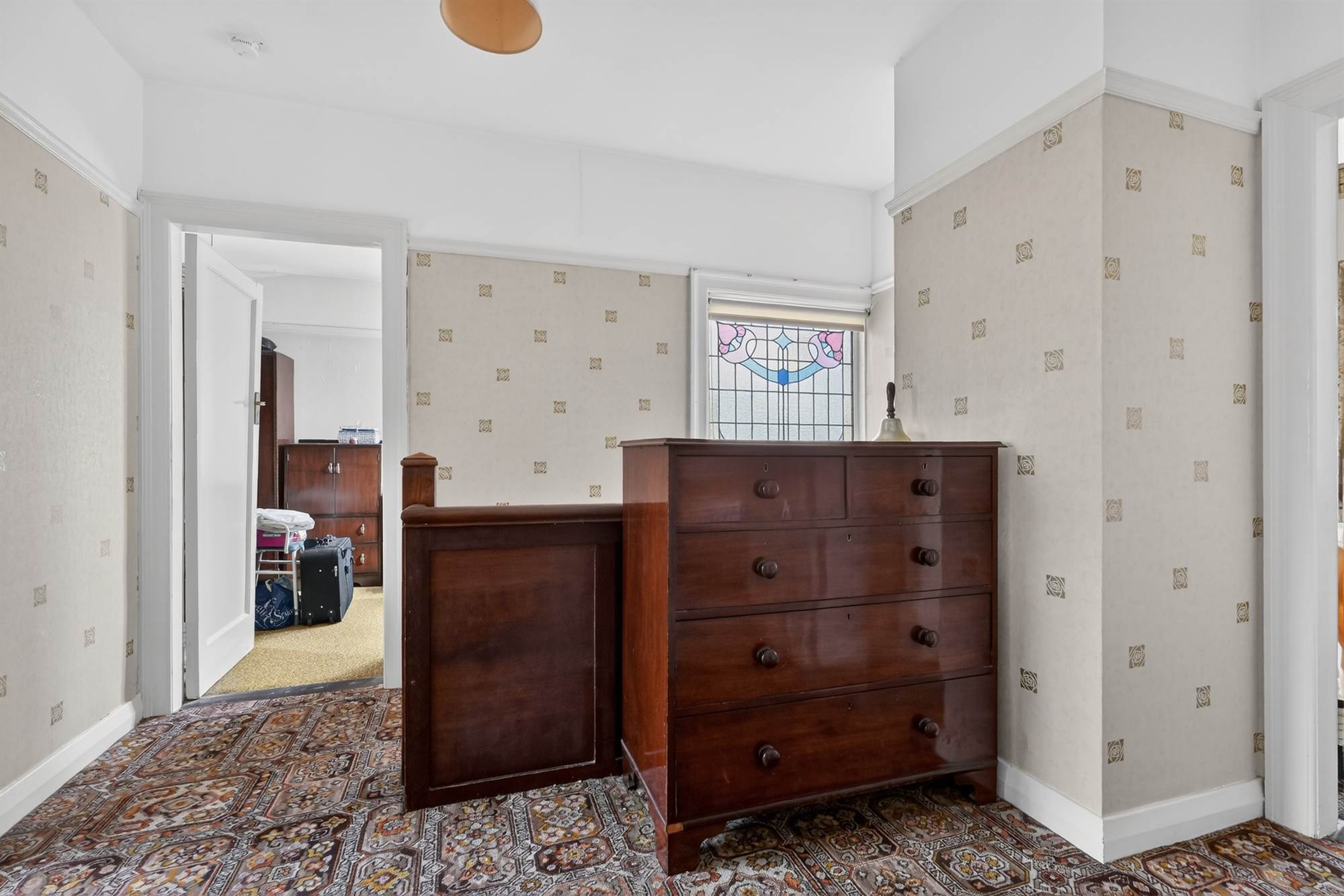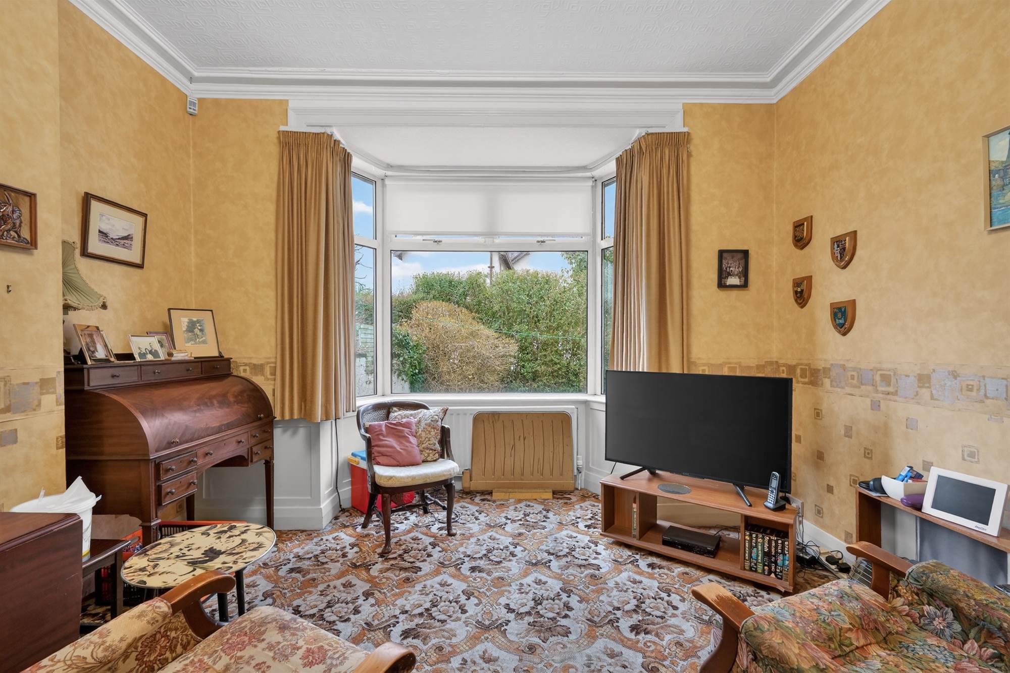 (at widest points). Marble fireplace with gas coal effect fire, wooden mantle, cornice ceiling, bay window, stained glass windows.