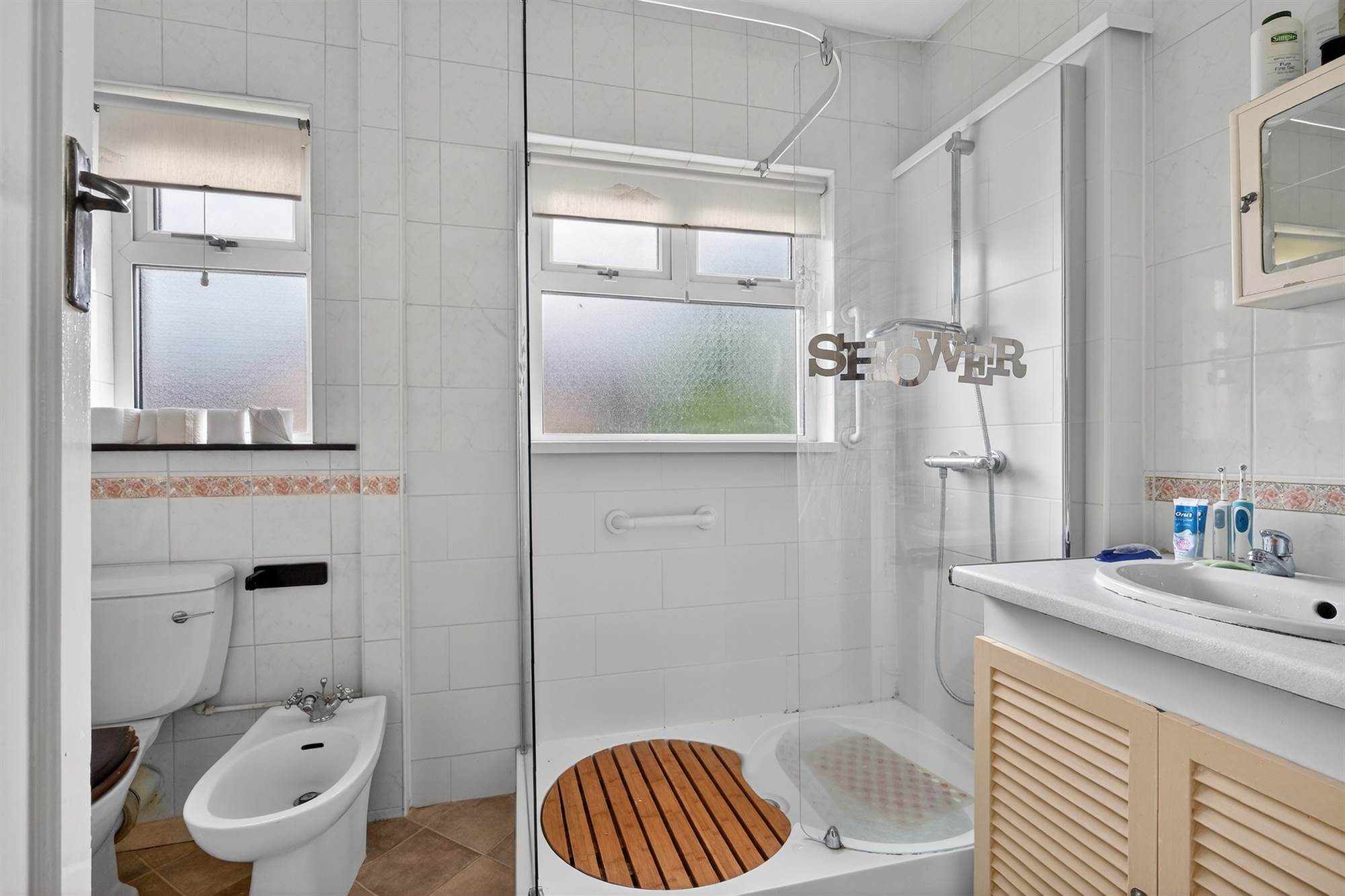 White suite comprising low flush wc, vanity unit with wash hand basin, bidet, fully tiled shower cubicle, fully tiled walls.
