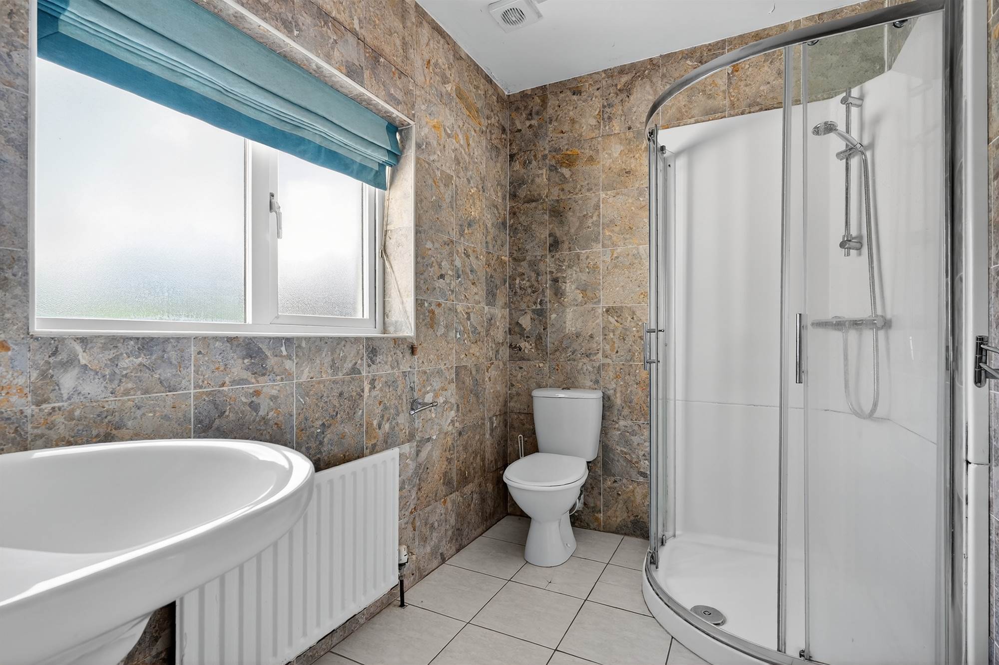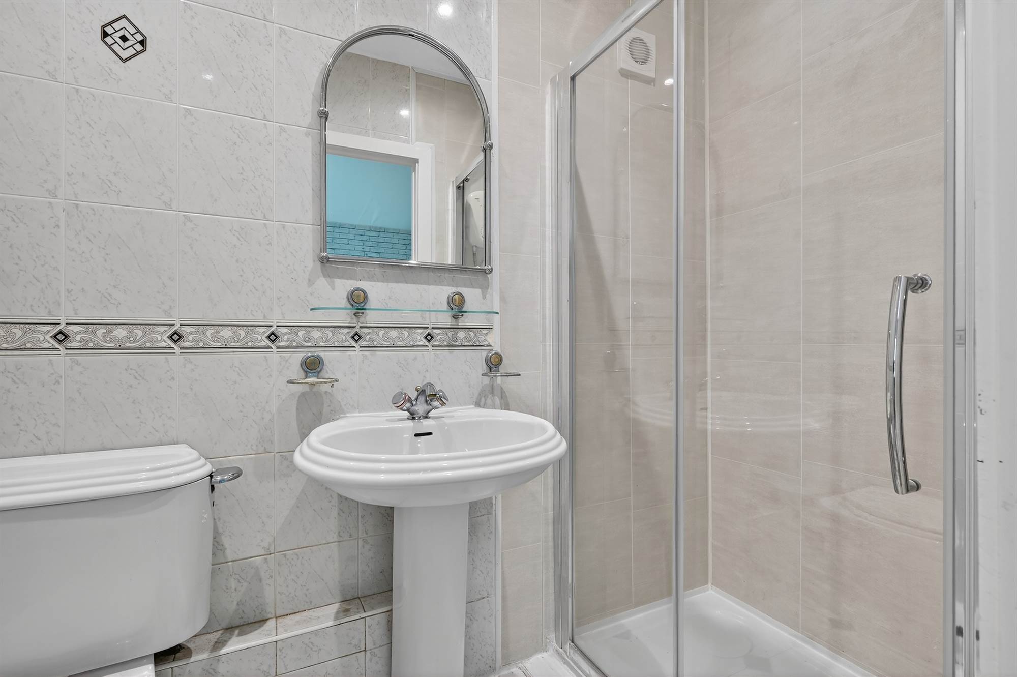 White suite comprising low flush wc, pedestal wash hand basin, fully tiled shower cubicle, ceramic tiled floor, low voltage spotlights, extractor fan.