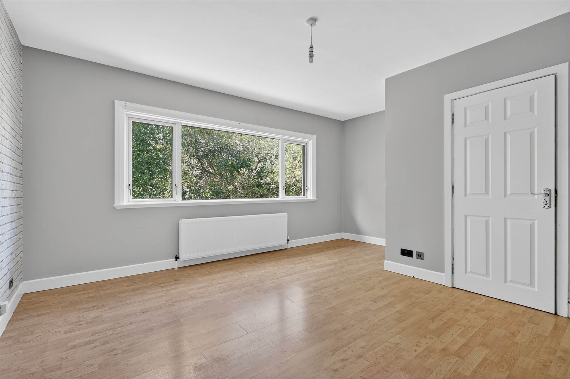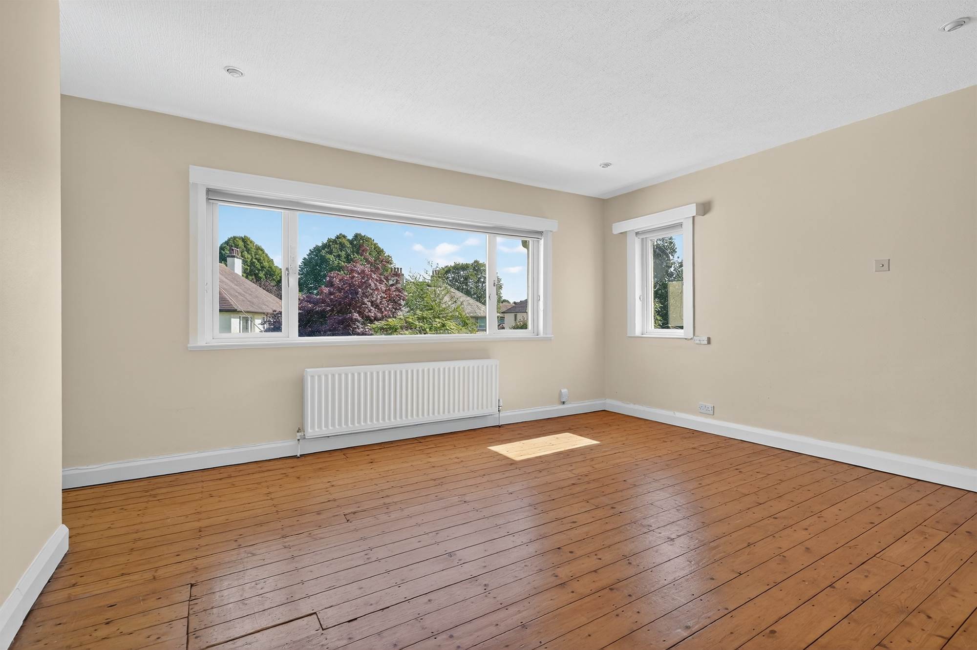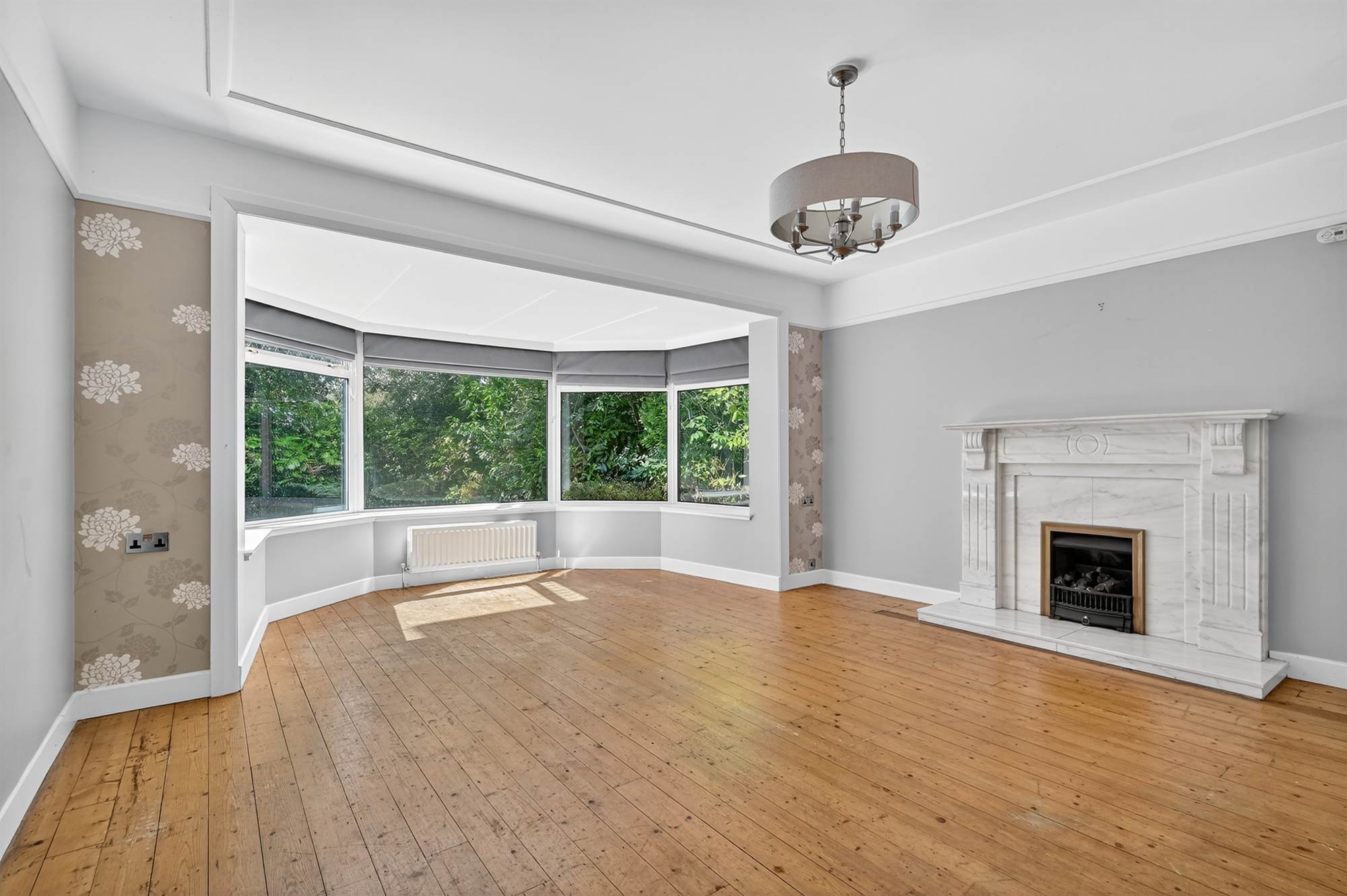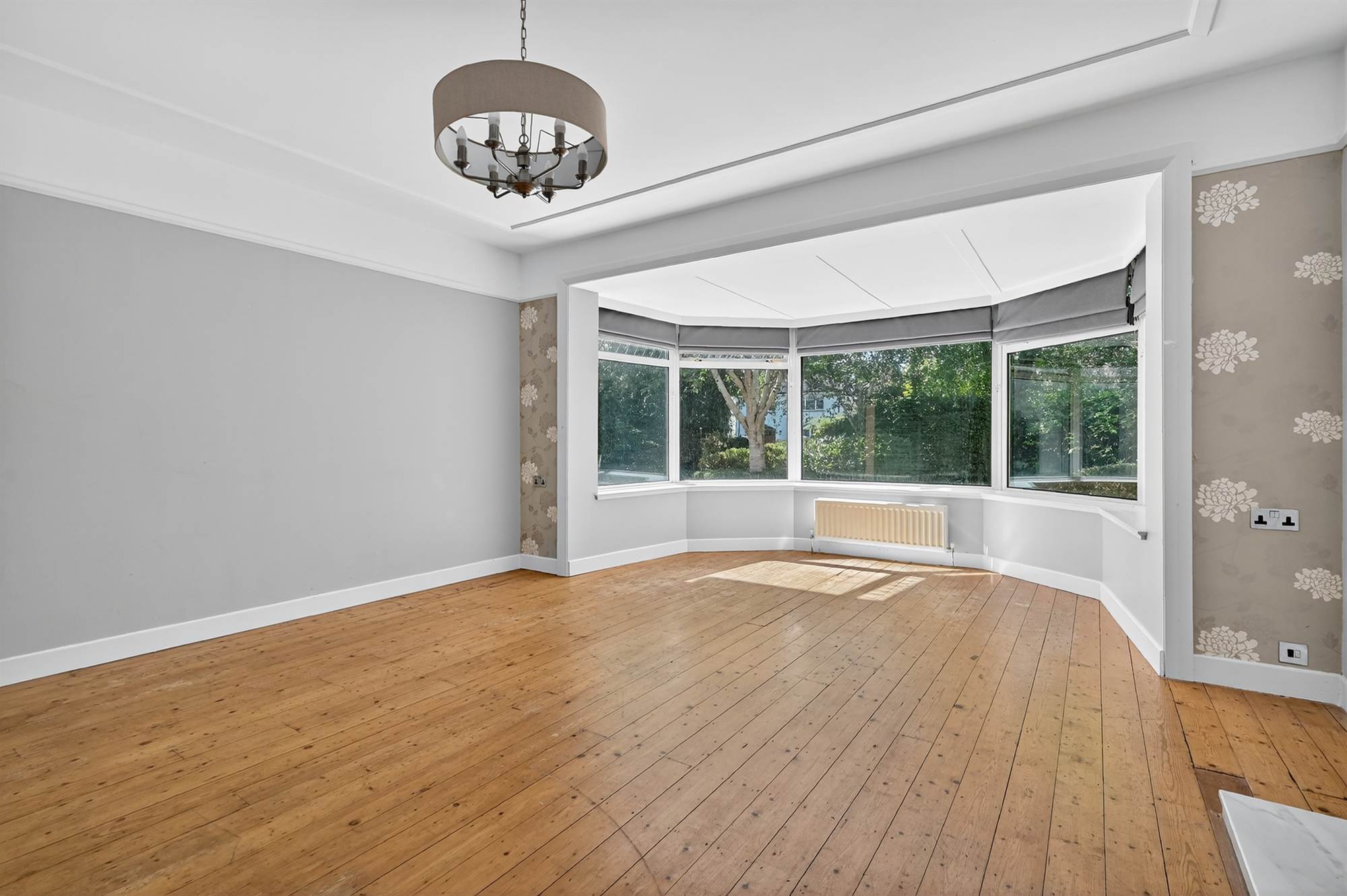 Marble fireplace, cornice ceiling, picture rail, bay window, wood strip floor.