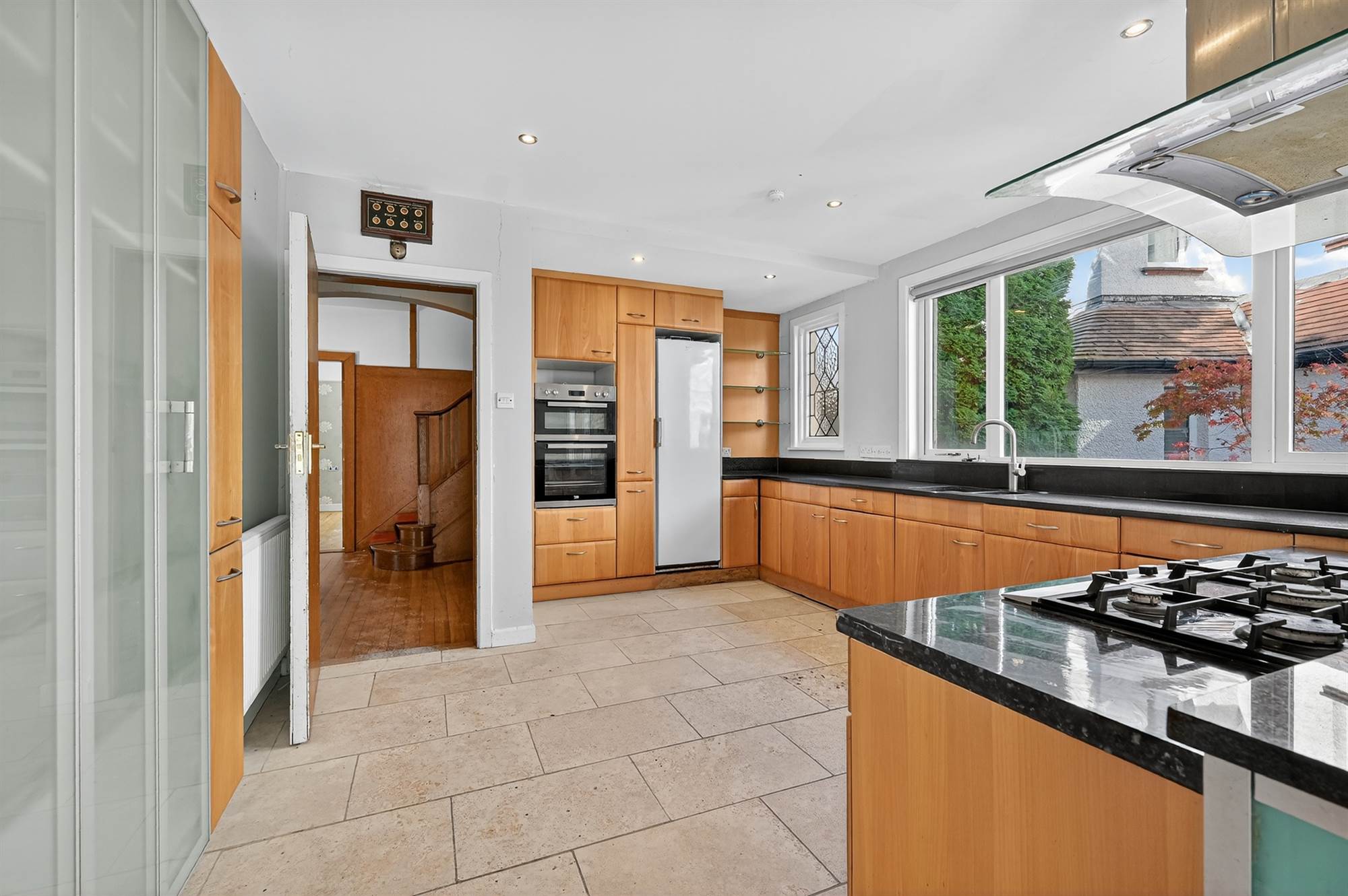 Range of high and low level units, granite work surface, 1.5 bowl stainless steel sink, granite drainer, integrated fridge freezer, integrated double oven, five ring gas hob, stainless steel extractor fan, integrated dishwasher, ceramic tiled floor, low voltage spotlights, uPVC doors to rear.
