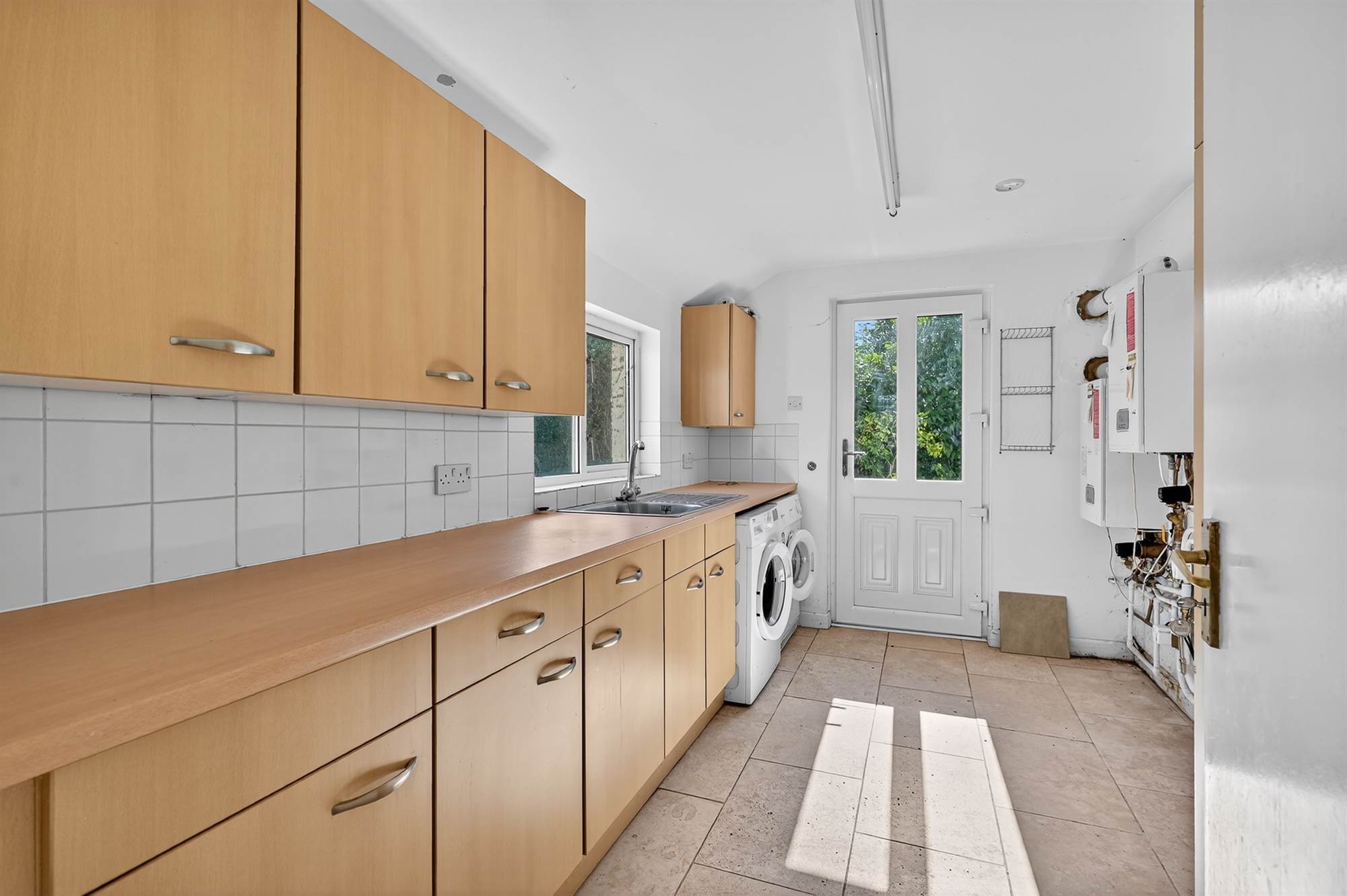 Range of high and low level units, work surfaces, single drainer stainless steel sink unit, plumbed for washing machine, space for tumble dryer, two gas boilers, ceramic tiled floor, door and glazing to rear.