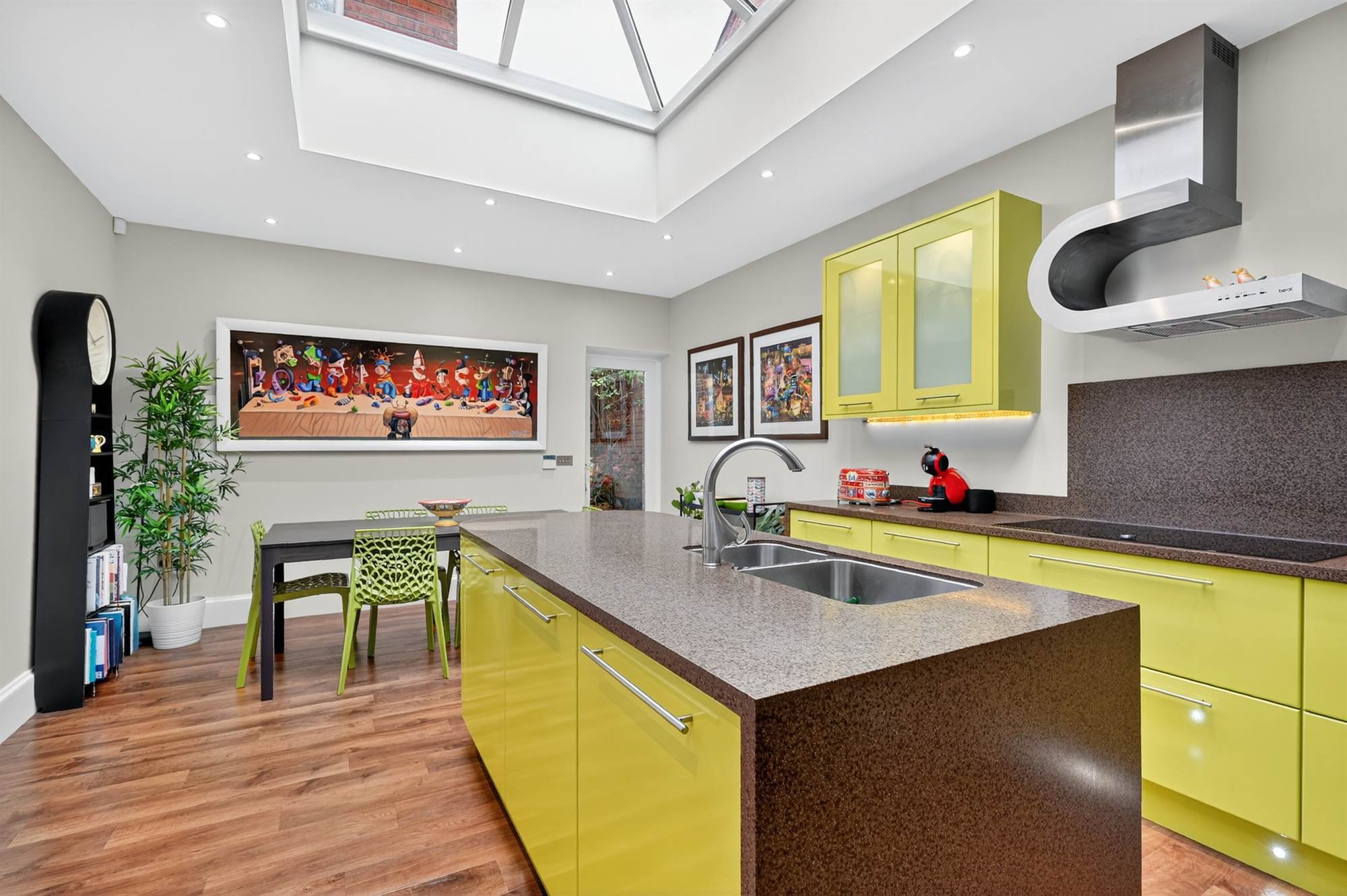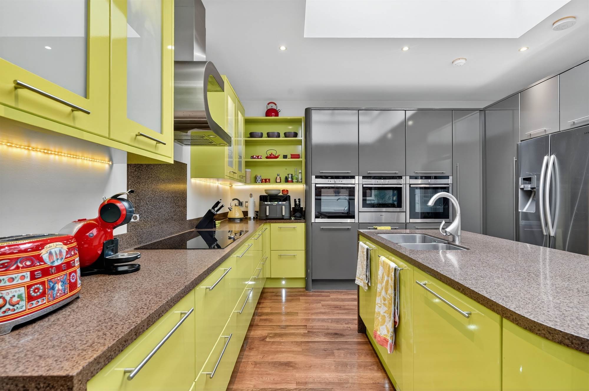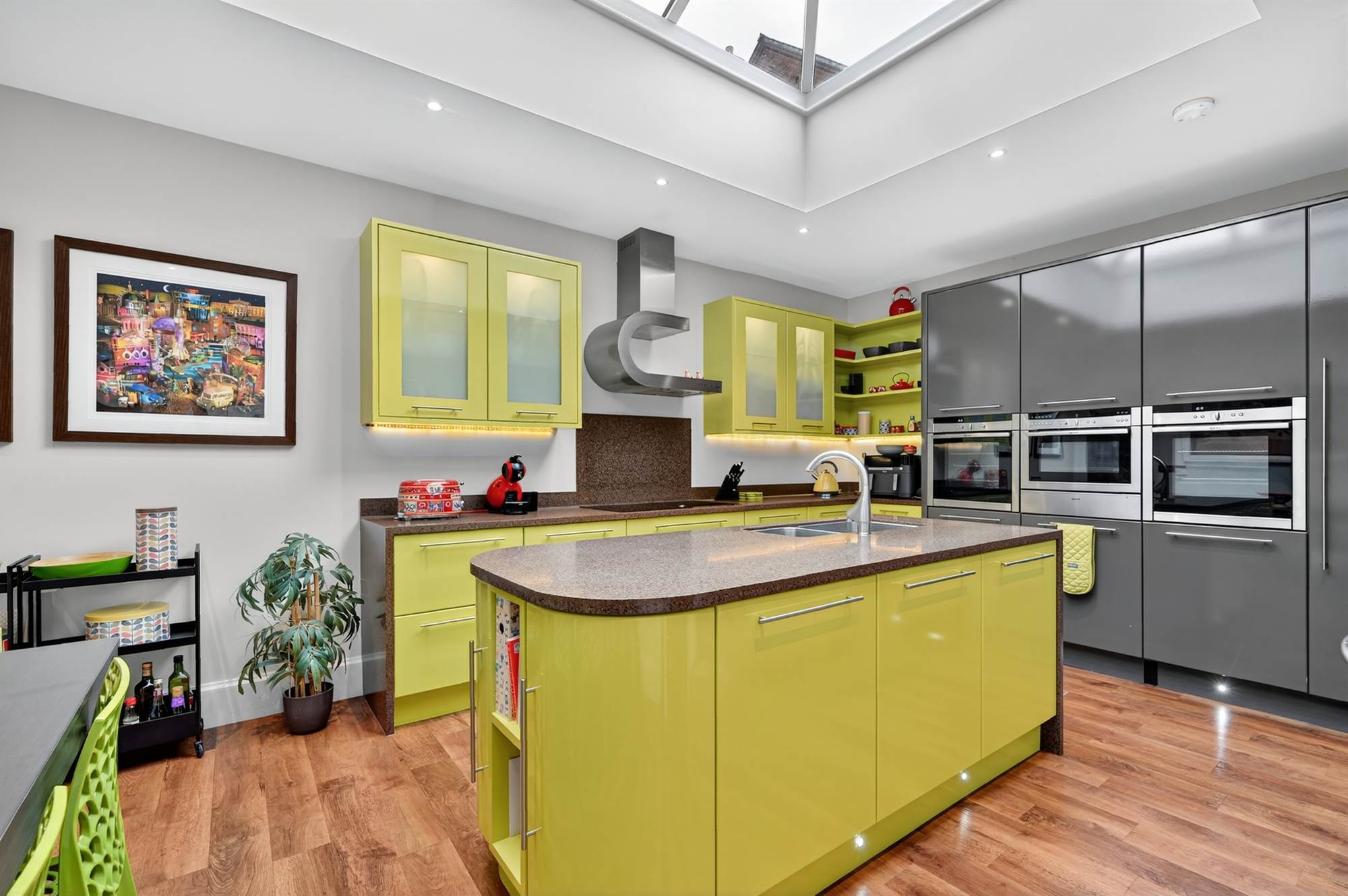 Range of high and low level units, glazed display cabinets, Corian work surfaces. Integrated Neff induction hob, stainless steel extractor fan. Integrated Neff double ovens, microwave and warming drawer, space for fridge/freezer. Island unit with units, Corian work surfaces. Two integrated Neff dishwashers, twin sinks, Karndean floor. Low voltage spotlights, glazed door to front, glazed roof.