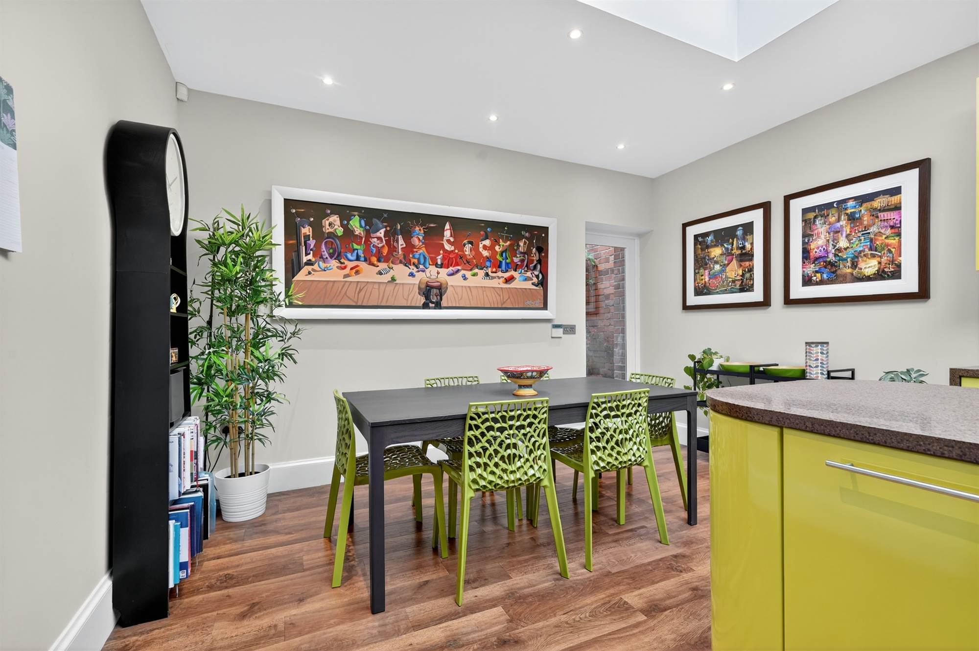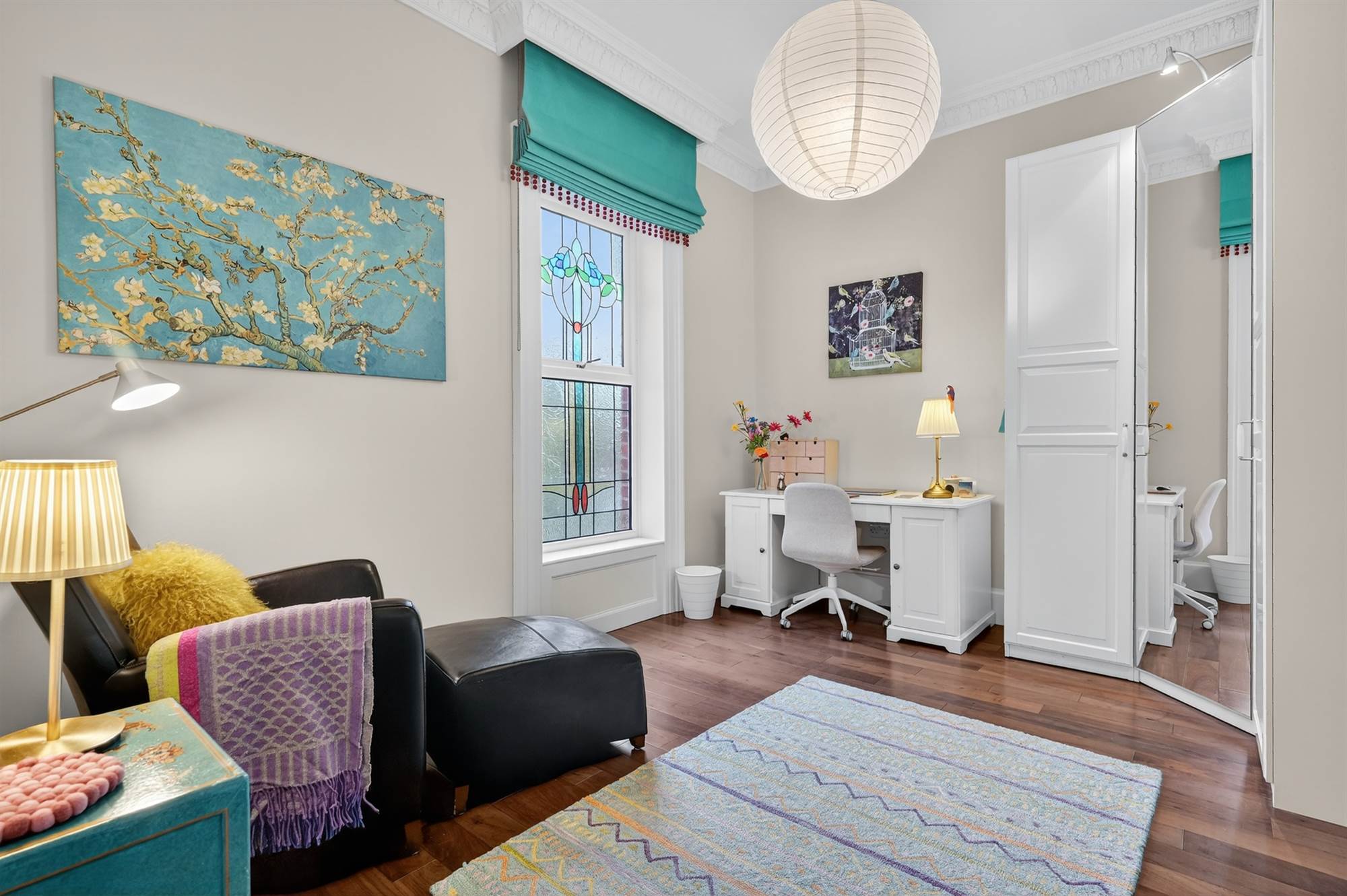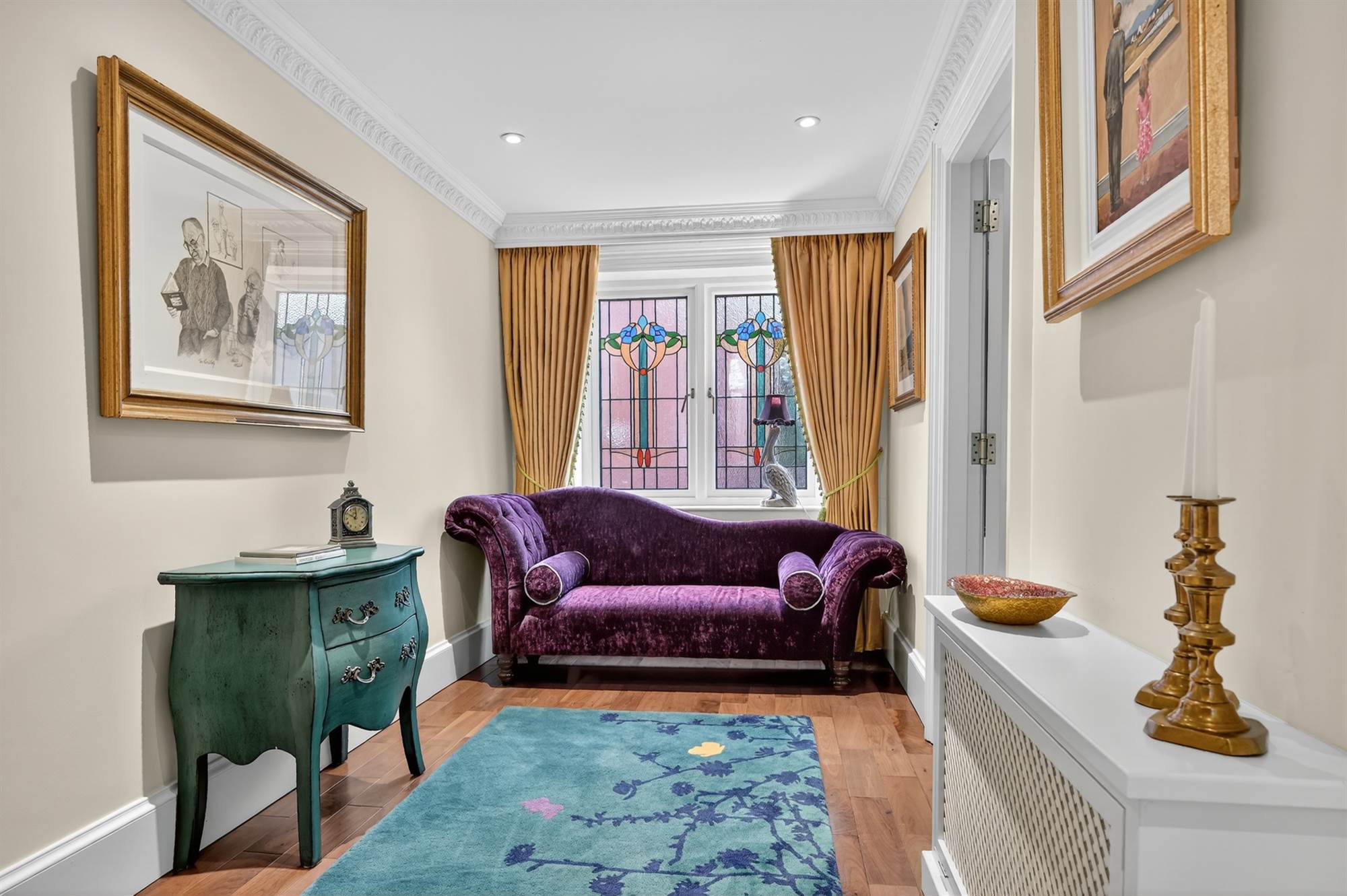 Walnut engineered wood flooring, stained glass window. Cornice ceiling, low voltage spotlights, access to roofspace (floored with light).