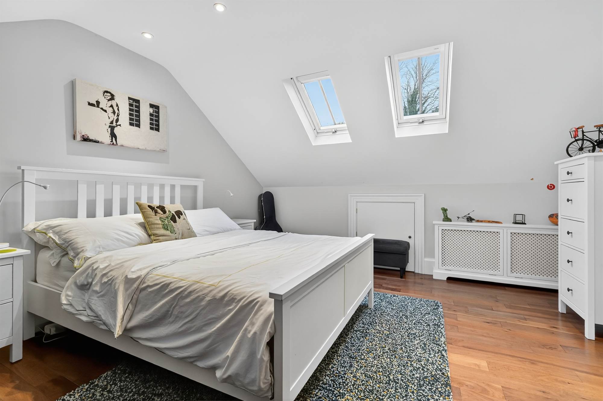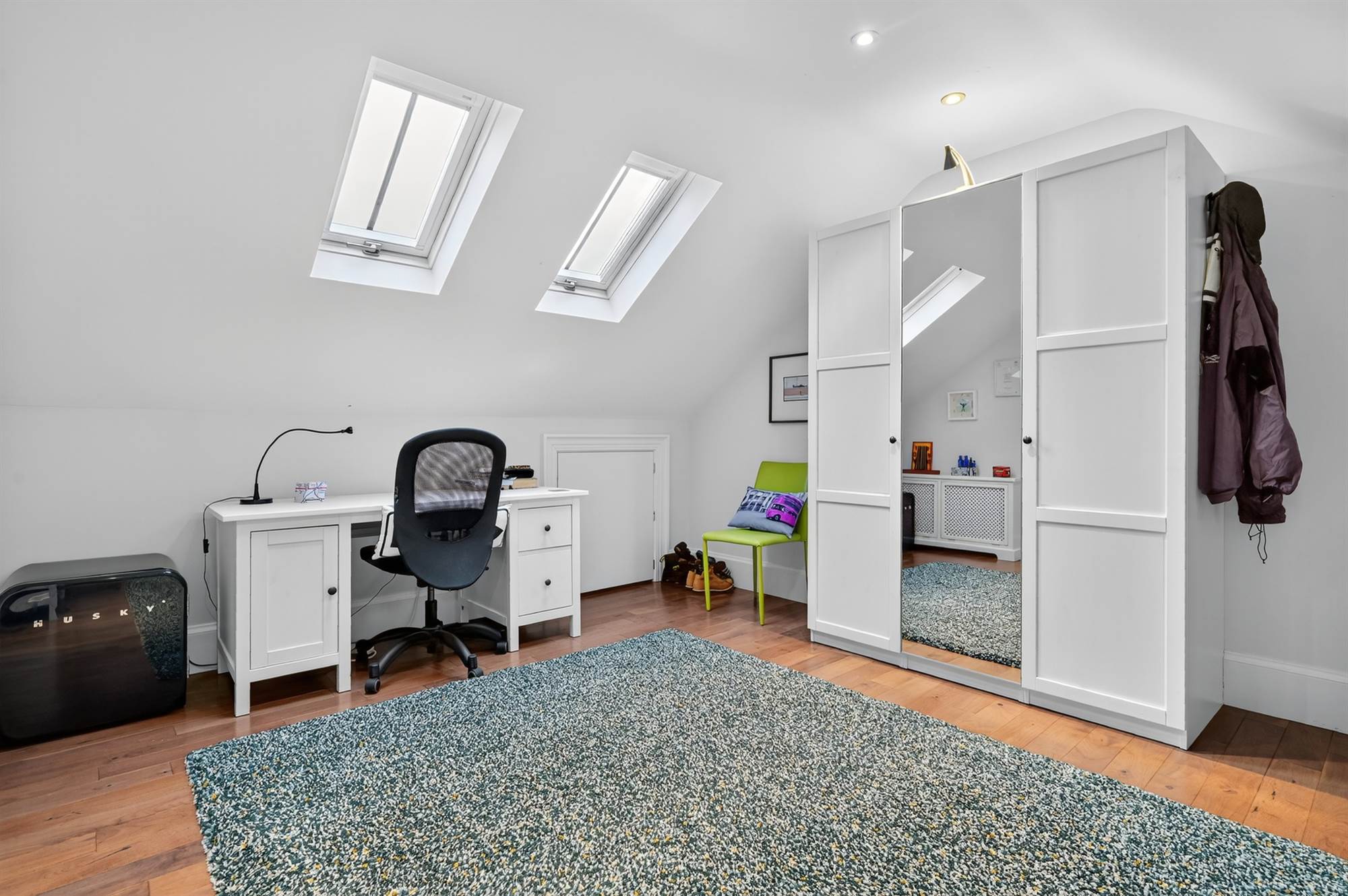 Walnut engineered wood flooring, access to eaves. Velux windows. Radiator cover.