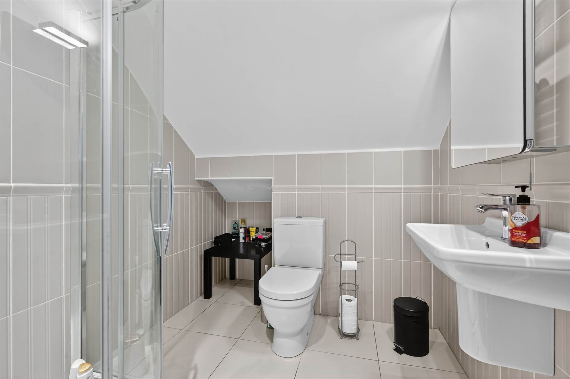 White suite comprising low flush wc, vanity unit with wash hand basin, fully tiled shower cubicle. Fully tiled walls, ceramic tiled floor, low voltage spotlights, extractor fan.