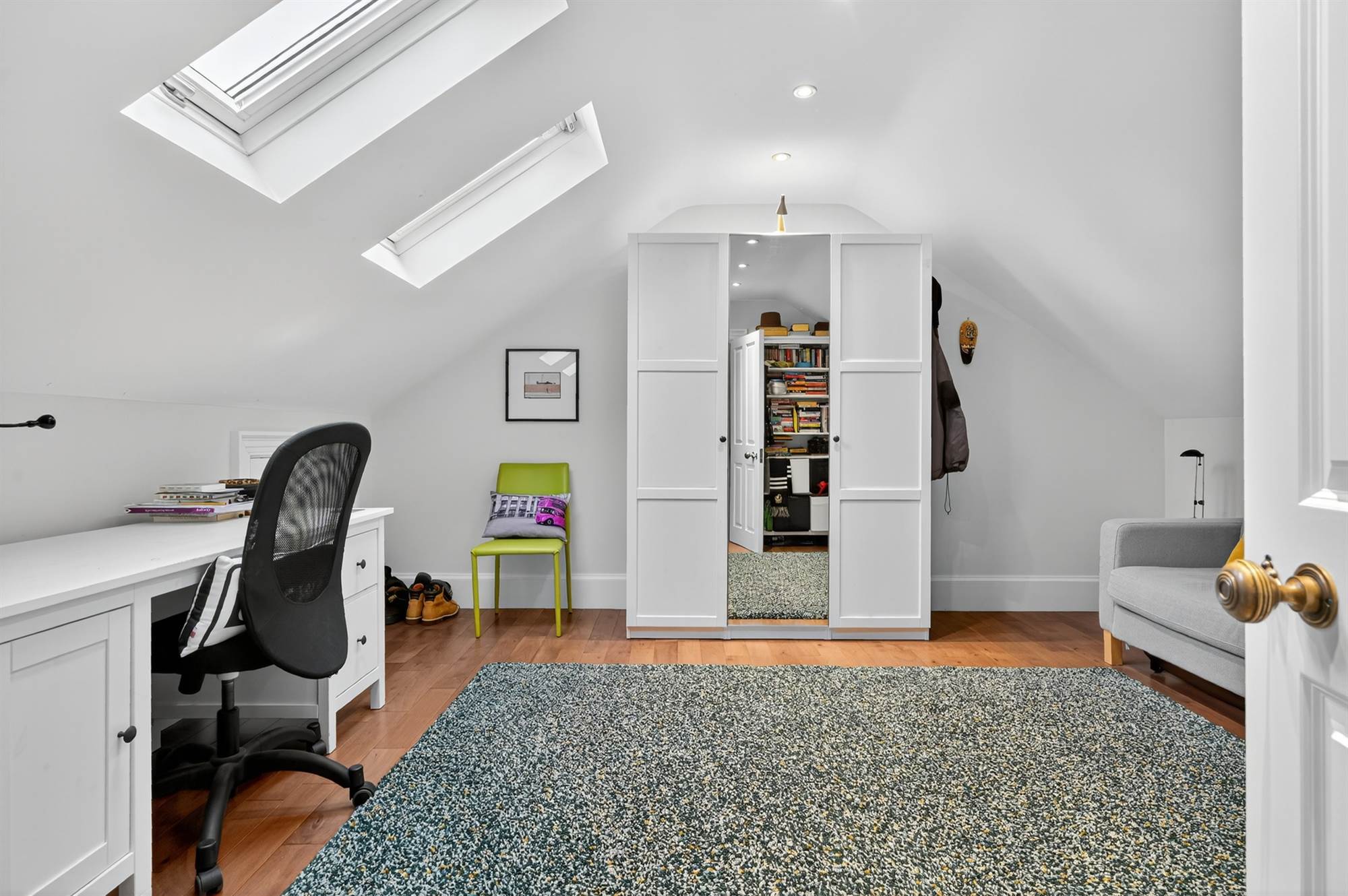 Walnut engineered wood flooring, Velux windows, storage into eaves, radiator covers.