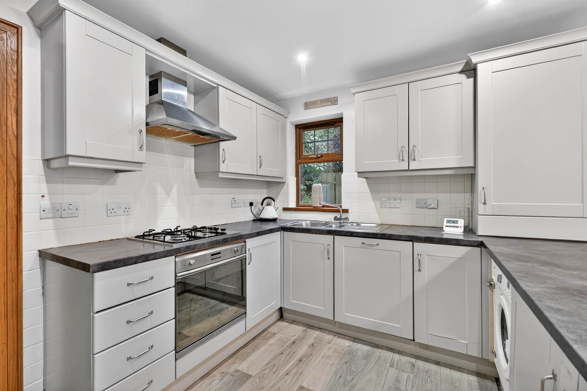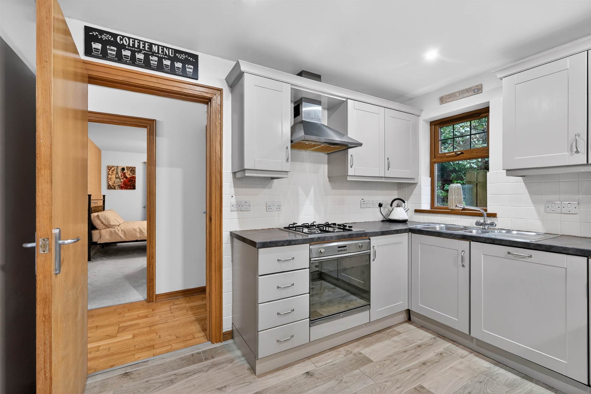 Range of high and low level units, work surfaces, four ring gas hob, stainless steel extractor fan, Smeg oven, integrated Smeg dishwasher, integrated Gorenje washing machine, integrated fridge and freezer, gas boiler, part tiled walls, part ceramic tiled floor, part oak floor.