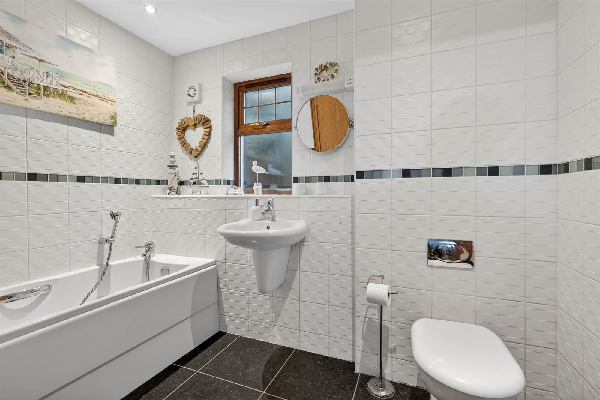 White suite comprising low flush wc, wash hand basin, panelled bath with hand shower, part tiled walls, ceramic tiled floor, low voltage spotlights, extractor fan, cupboard with tank.
