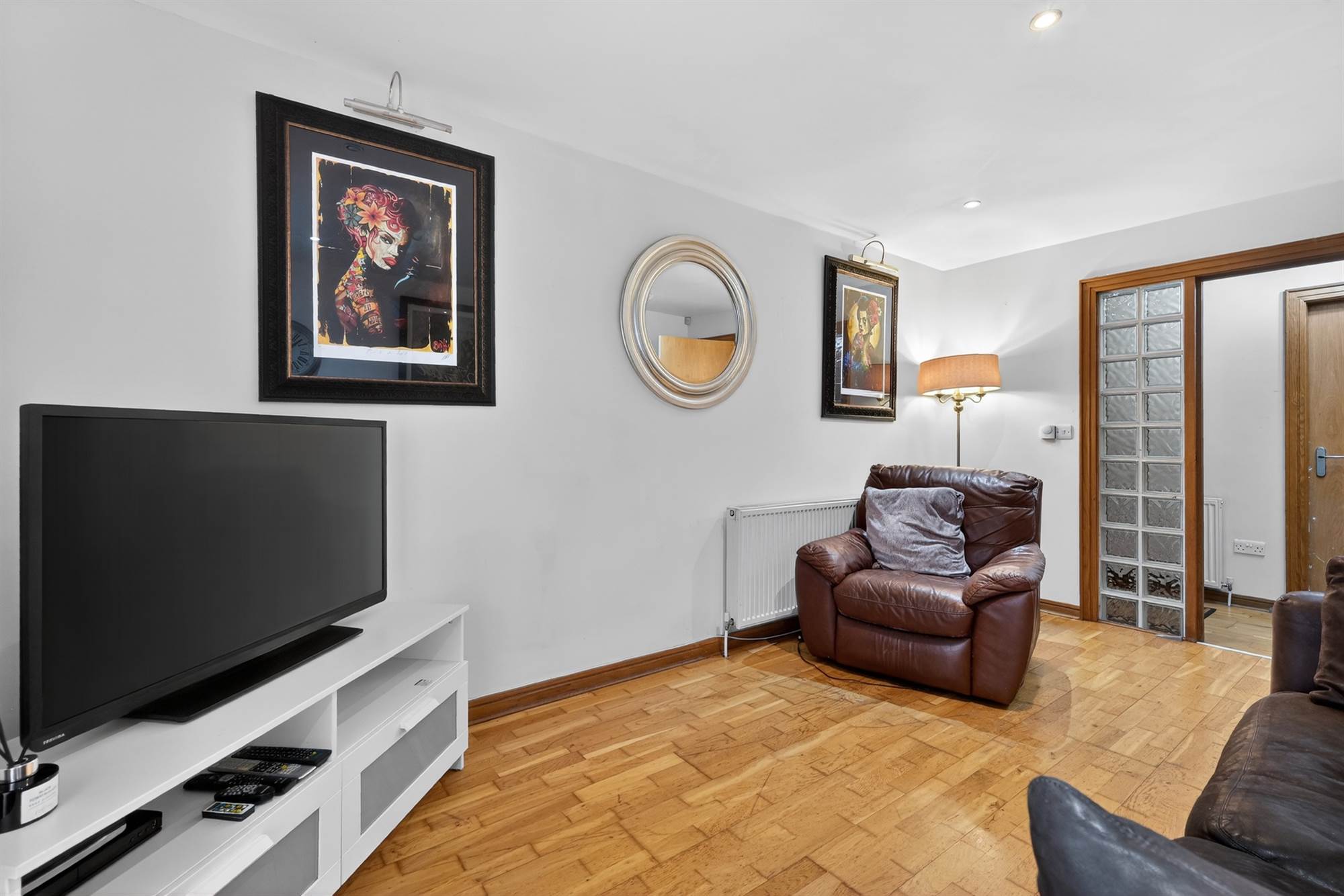 Oak floor, low voltage spotlights.