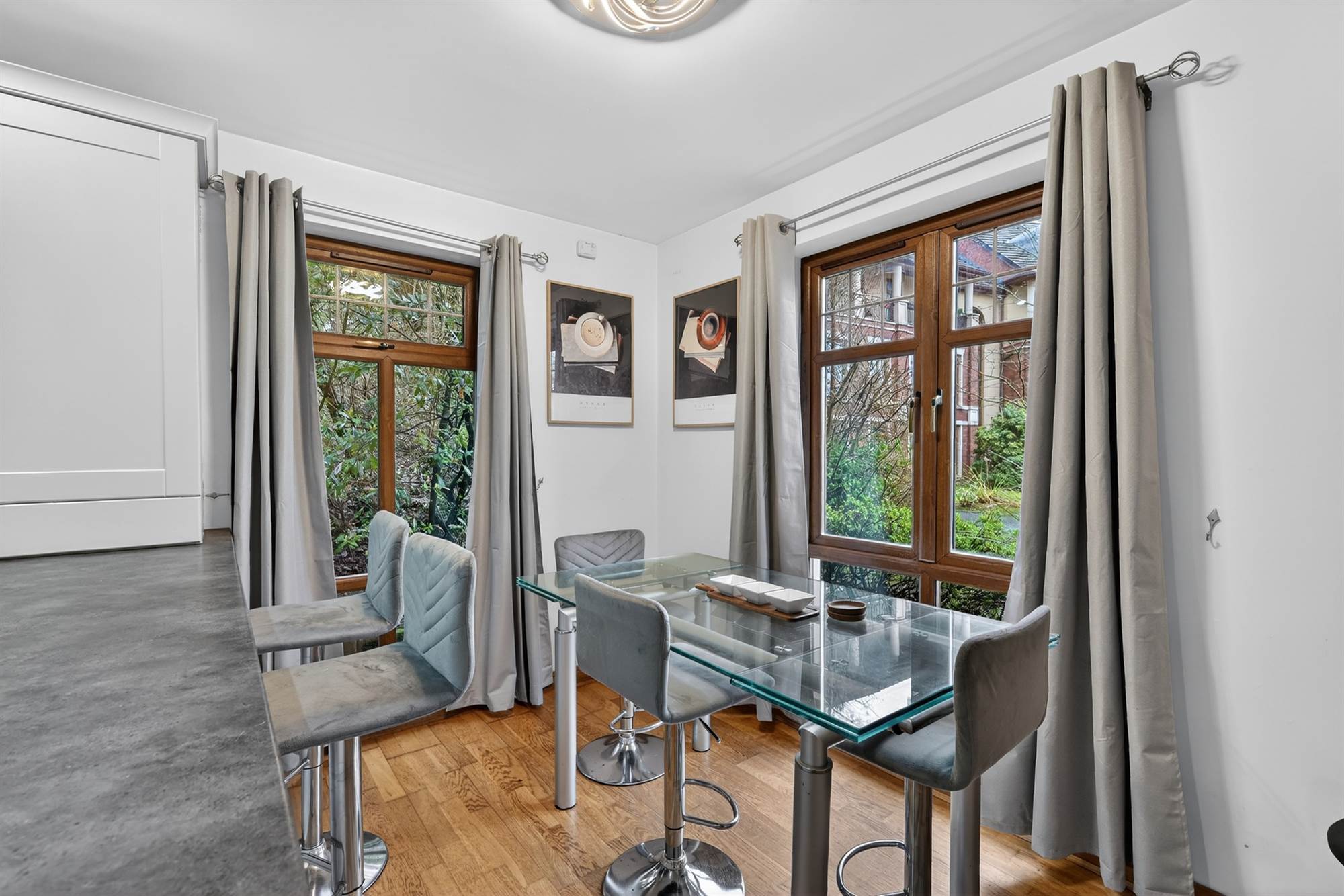 Oak floor, intercom phone.