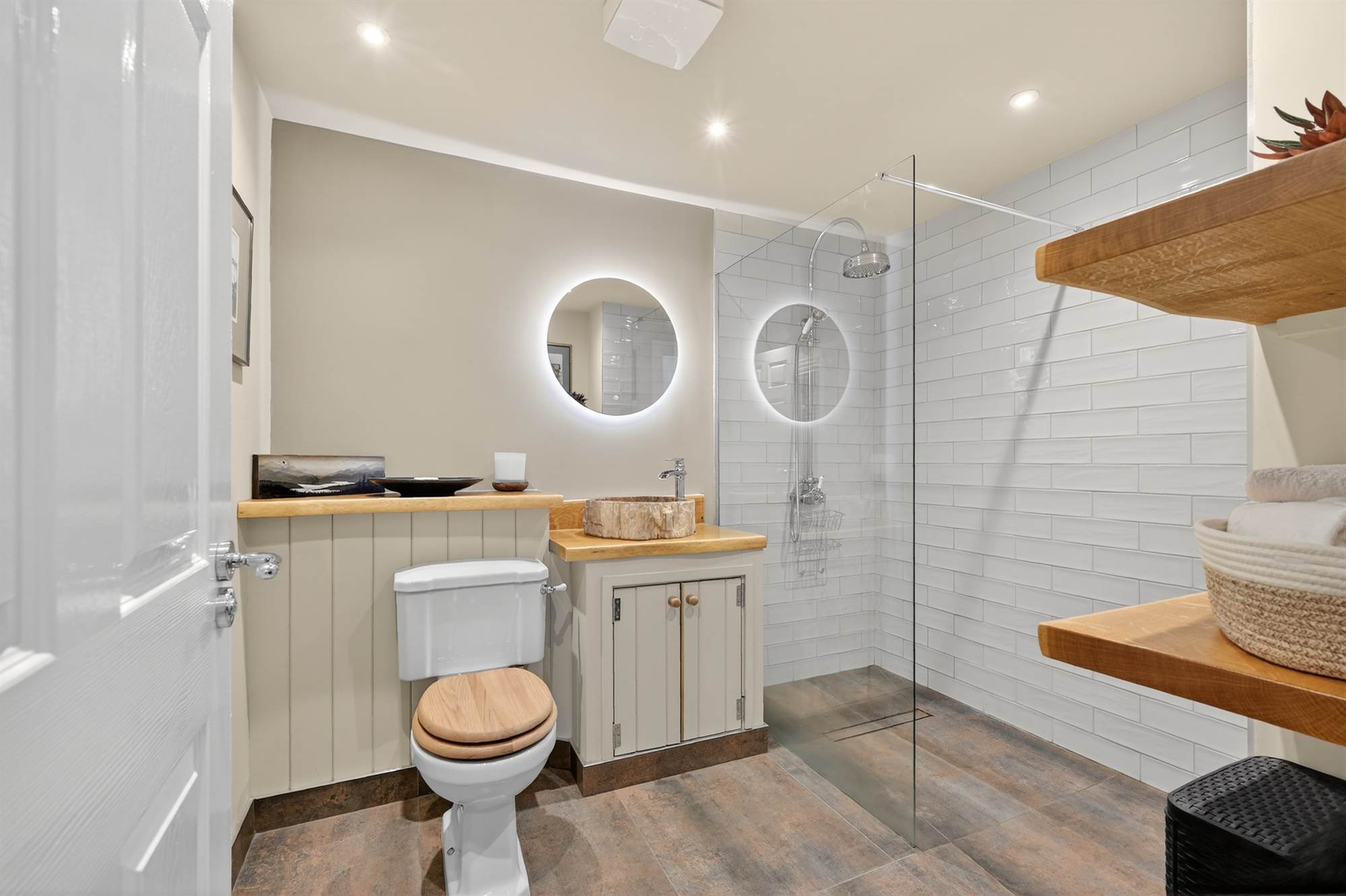 White suite comprising low flush wc, vanity sink unit with timber top, chrome mixer taps, built-in shower with drying area and chrome overhead shower unit, tiled splashback, extractor fan, heated towel rail, porcelain tiled floor, built-in shelving.