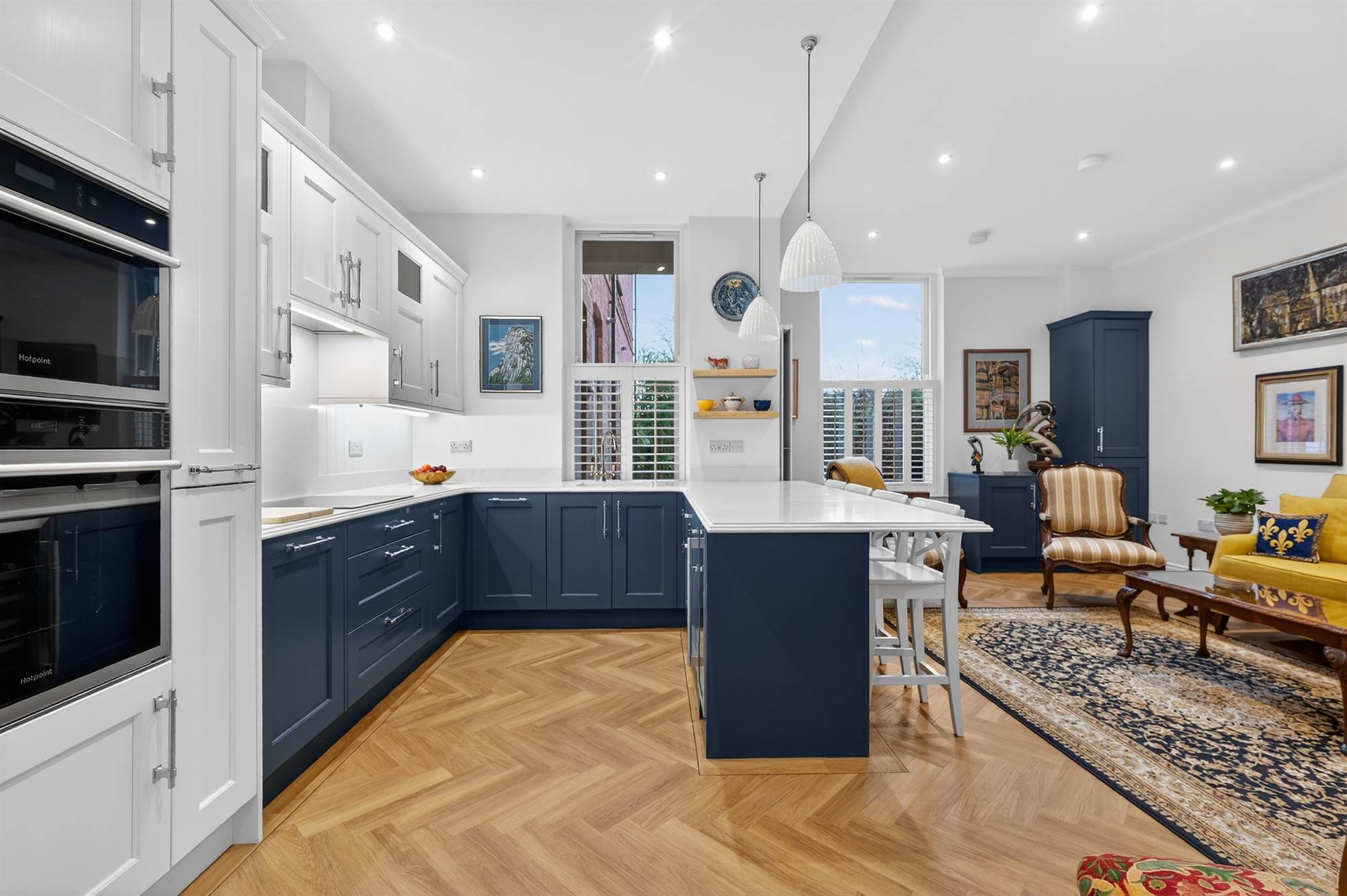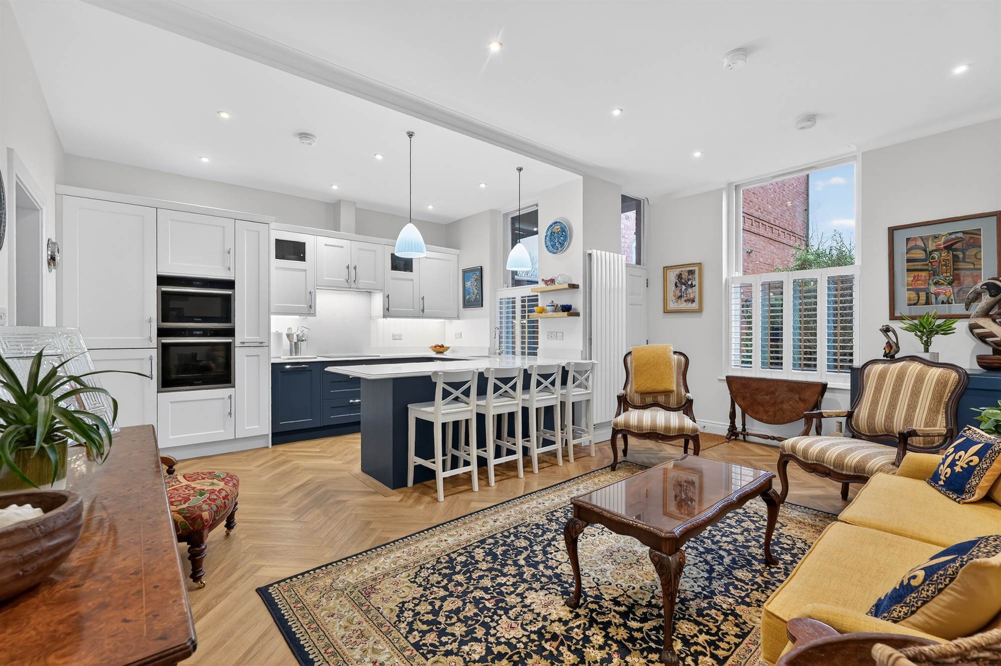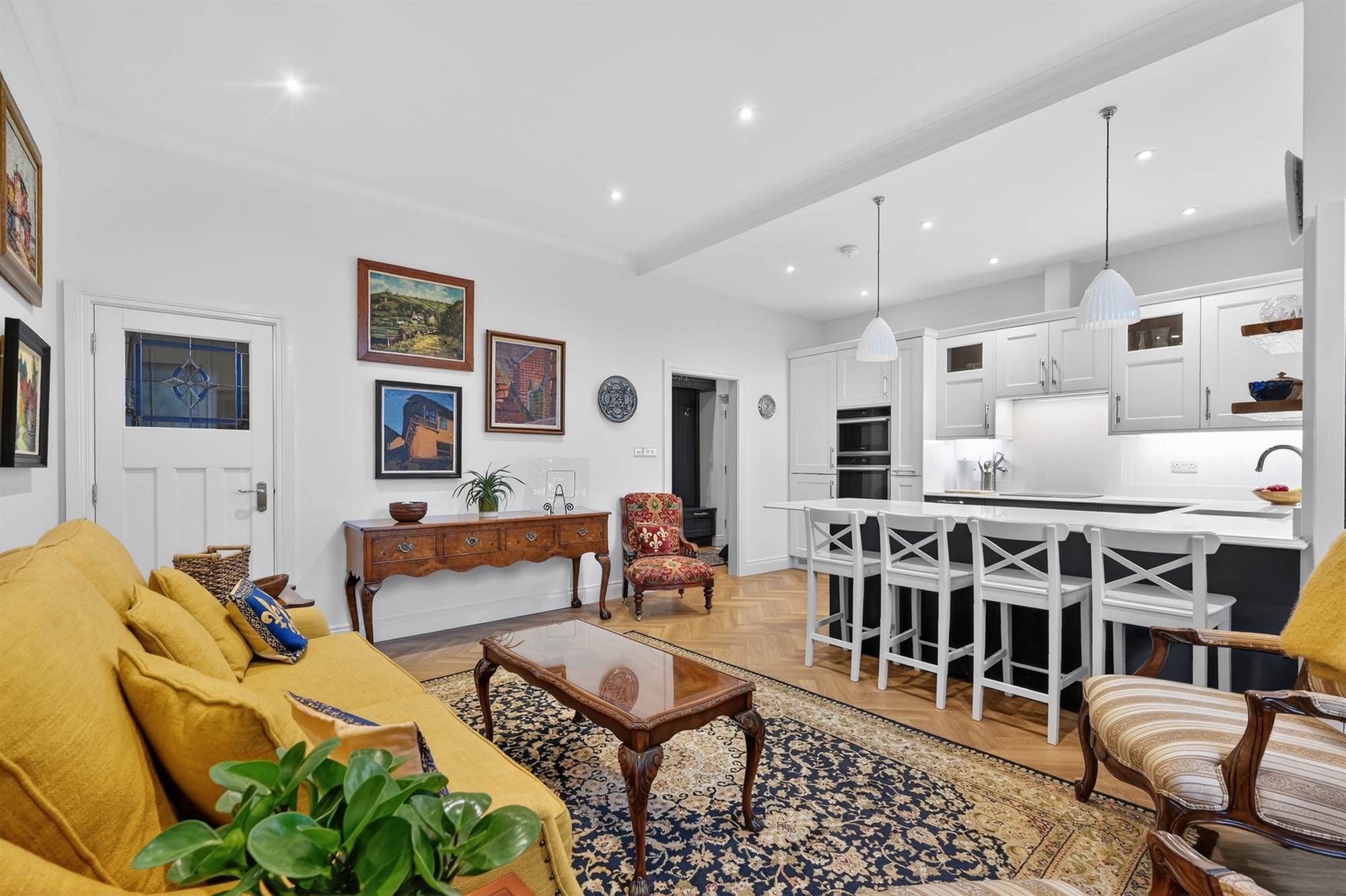 Excellent range of high and low level units, built-in Hotpoint oven and additional combi oven/microwave above, integrated fridge and freezer, pull-out larder cupboard, bin disposal unit, integrated four ring induction hob with extractor fan above, quartz stone worktops, single drainer sink and a half sink unit with mixer taps, additional pull-out larder cupboards, built-in wine cooler, integrated washing machine, integrated dishwasher, low voltage spotlights. Built-in breakfast bar with pendant lights, luxurious vinyl oak herringbone style floor. Open to living and dining space with mature outlook to front. Cornice ceiling, concealed Ideal gas fired boiler with additional built-in cupboards. Access door to gardens with glazed toplight. Built-in storage cupboard with additional storage cupboard under stairs.