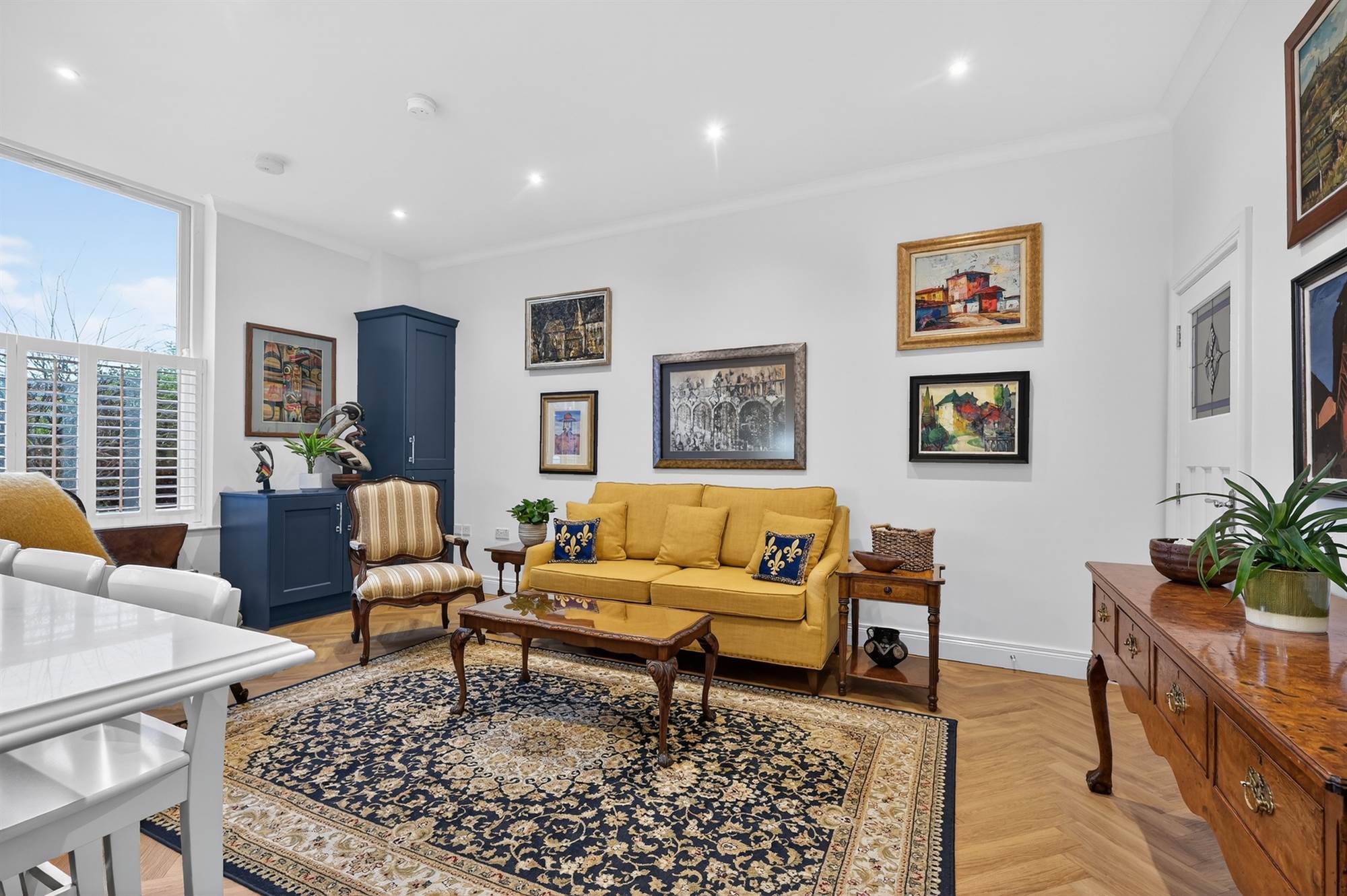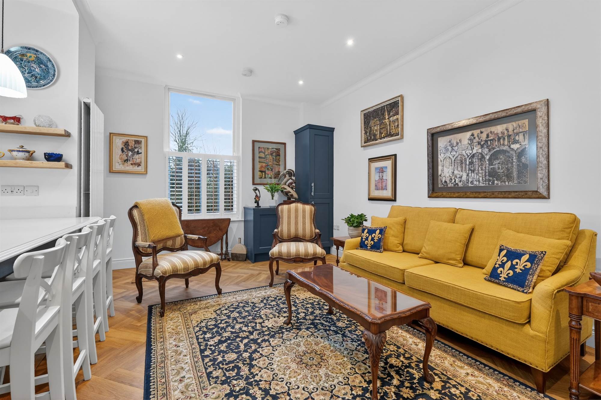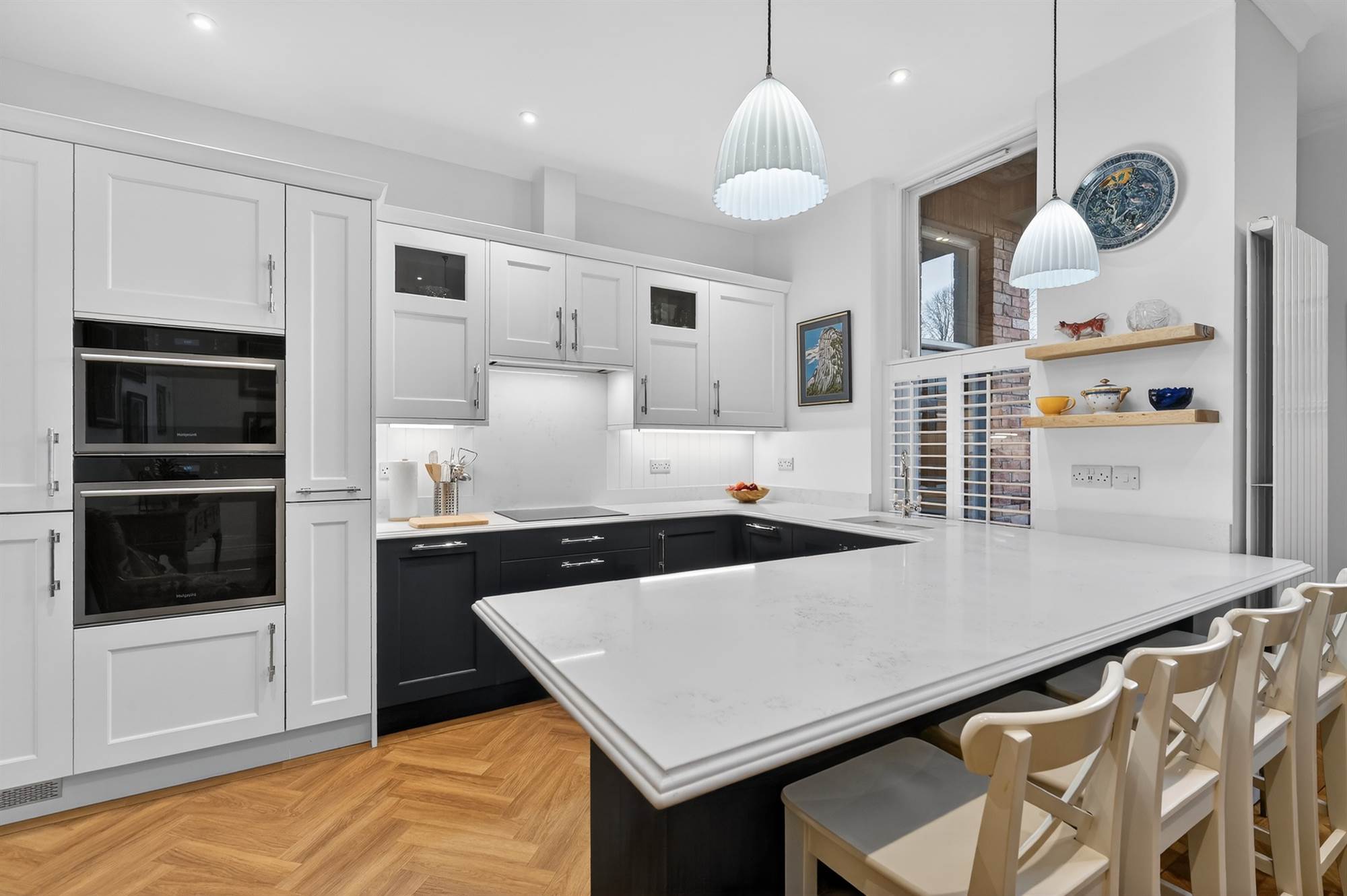 Excellent range of high and low level units, built-in Hotpoint oven and additional combi oven/microwave above, integrated fridge and freezer, pull-out larder cupboard, bin disposal unit, integrated four ring induction hob with extractor fan above, quartz stone worktops, single drainer sink and a half sink unit with mixer taps, additional pull-out larder cupboards, built-in wine cooler, integrated washing machine, integrated dishwasher, low voltage spotlights. Built-in breakfast bar with pendant lights, luxurious vinyl oak herringbone style floor. Open to living and dining space with mature outlook to front. Cornice ceiling, concealed Ideal gas fired boiler with additional built-in cupboards. Access door to gardens with glazed toplight. Built-in storage cupboard with additional storage cupboard under stairs.