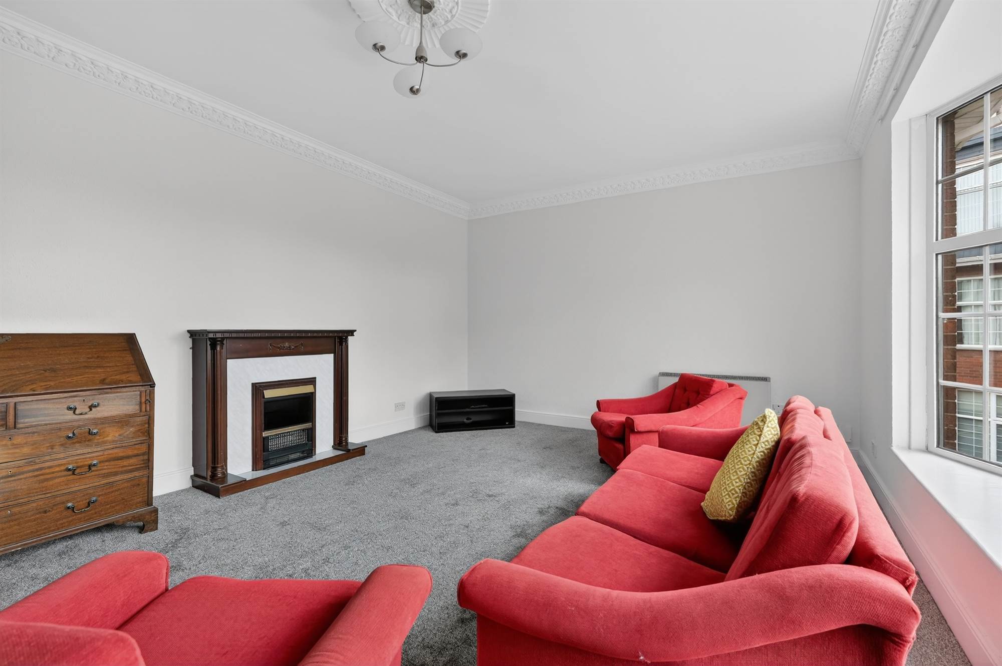 (at widest points). Attractive mahogany fireplace with wooden surround, marble effect inset and hearth, bay window, cornice ceiling, ceiling rose.