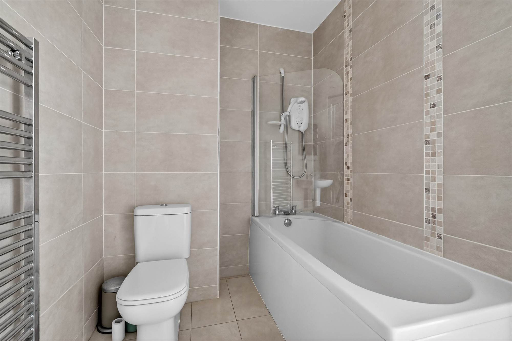 White suite comprising low flush wc, pedestal wash hand basin, panelled bath with electric shower above, fully tiled walls, ceramic tiled floor, heated towel rail, extractor fan, airing cupboard.