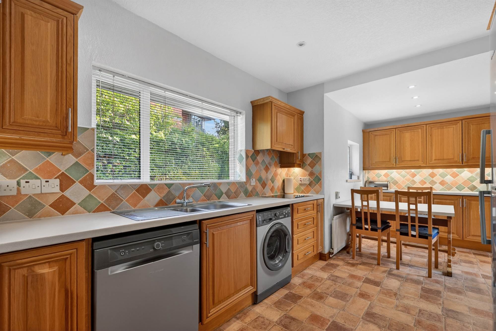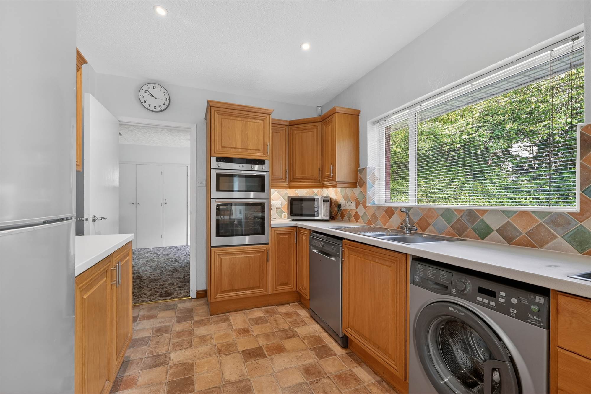 (at widest points). Range of high and low level units, work surfaces, one and a half bowl single drainer stainless steel sink unit, integrated Neff double oven, integrated Neff hob, extractor fan over, space for fridge/freezer, plumbed for washing machine and dishwasher. Part tiled walls, uPVC door to rear.