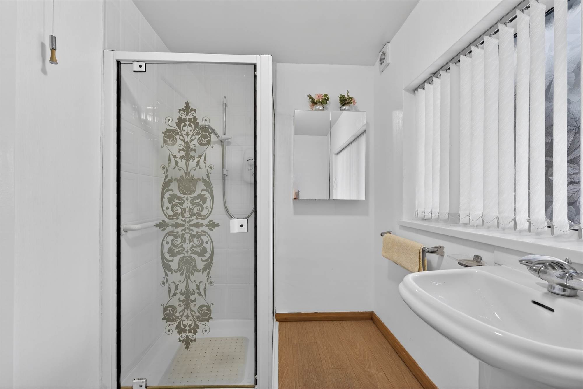 Low flush wc, pedestal wash hand basin, fully tiled shower cubicle with electric shower, tiled floor, extractor fan.