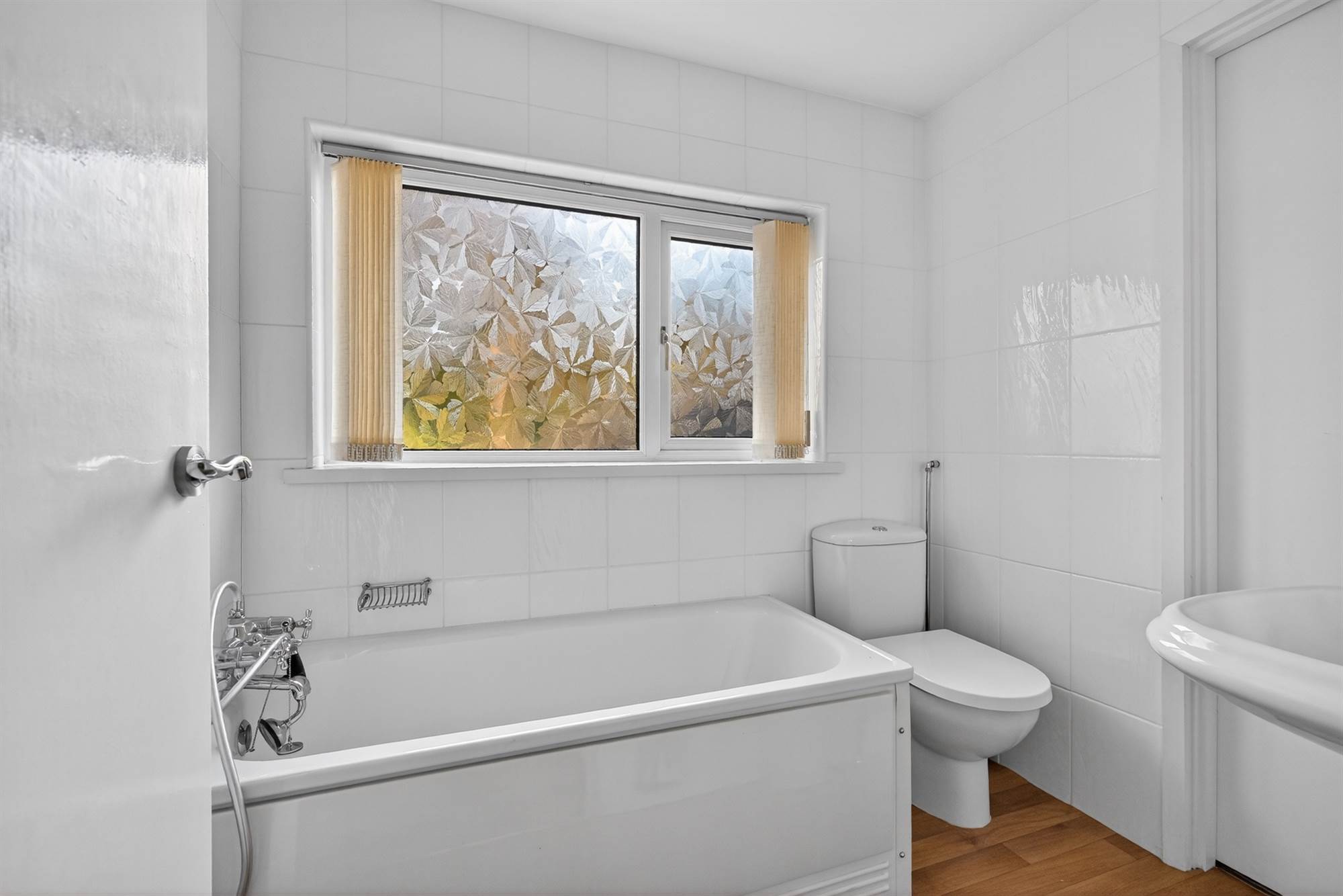 White suite comprising low flush wc, panelled bath with hand shower, fully tiled walls.
