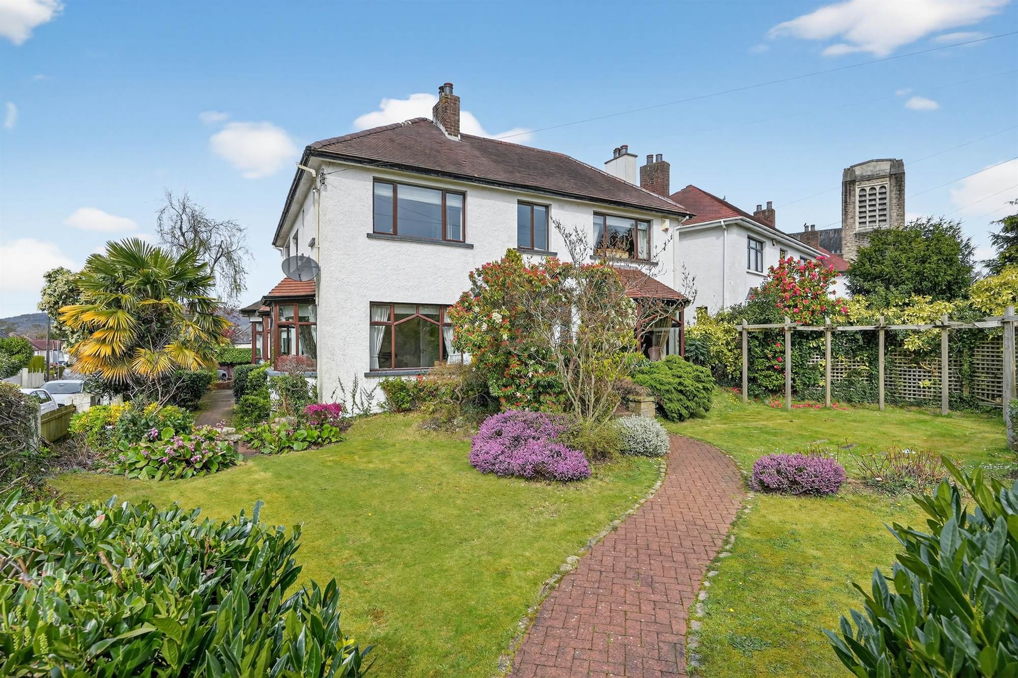Externally, the property is enhanced by mature, landscaped gardens to the front with lawns, planted beds, and character features including a stone archway. The rear garden is south-facing and features lawns, planted beds, and a generous paved patio area. Pillared entrance gates lead to a paved driveway with parking for multiple vehicles and access to a double-length garage.
