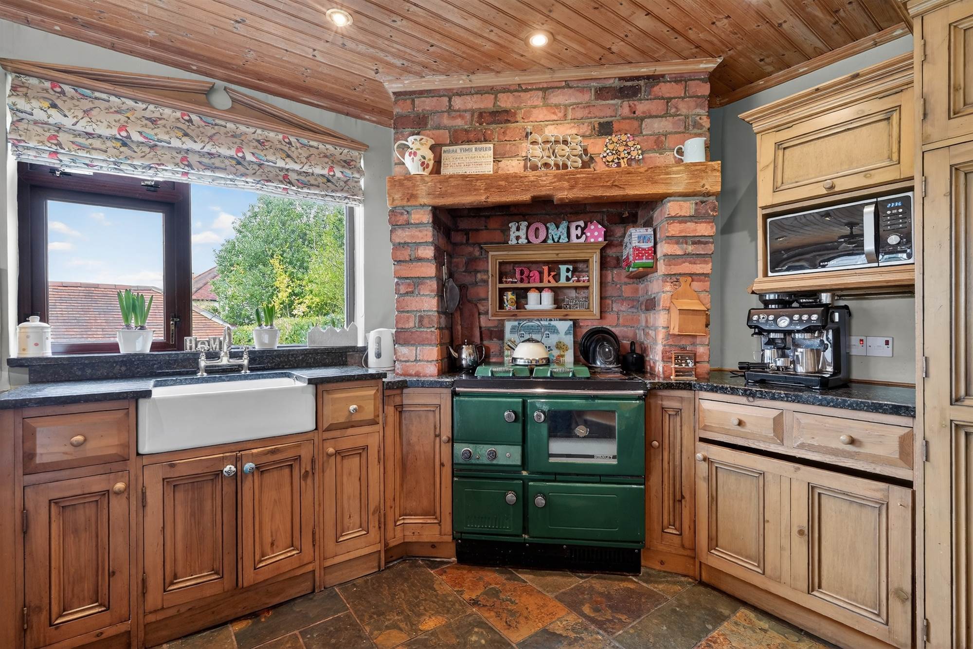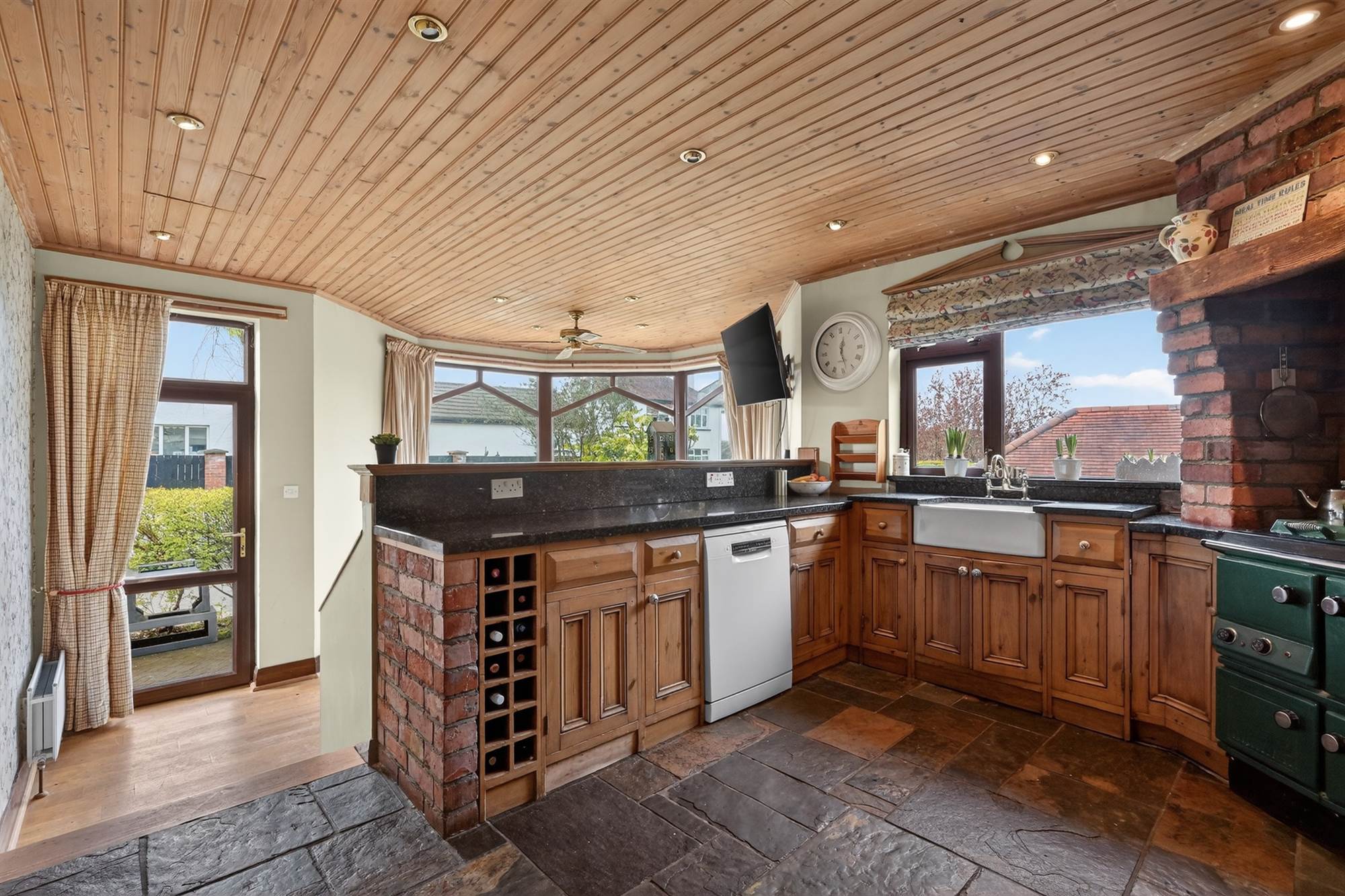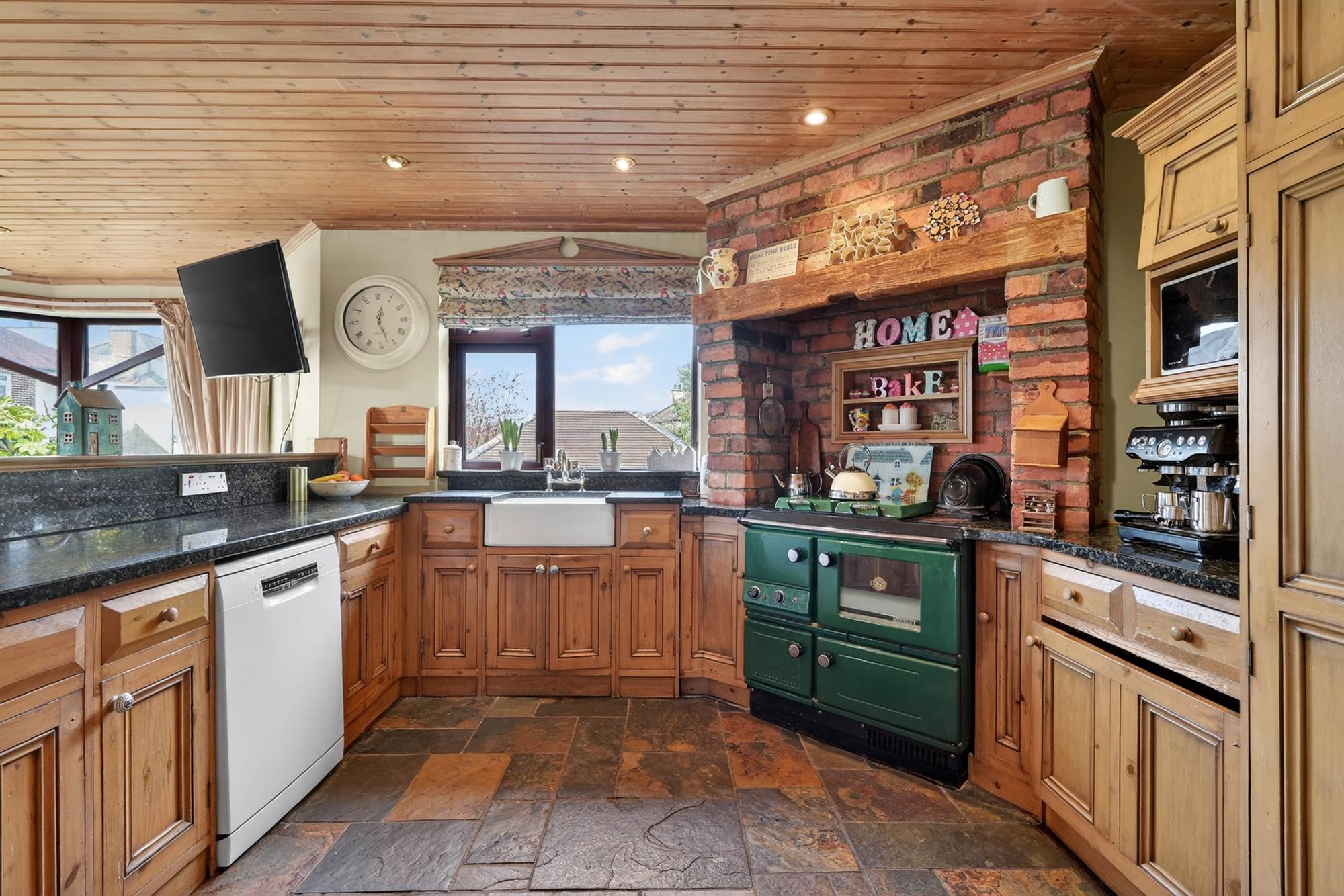 Impressive country-style kitchen with handmade pine units, granite worktops, Belfast sink, Stanley range, and exposed brick detailing