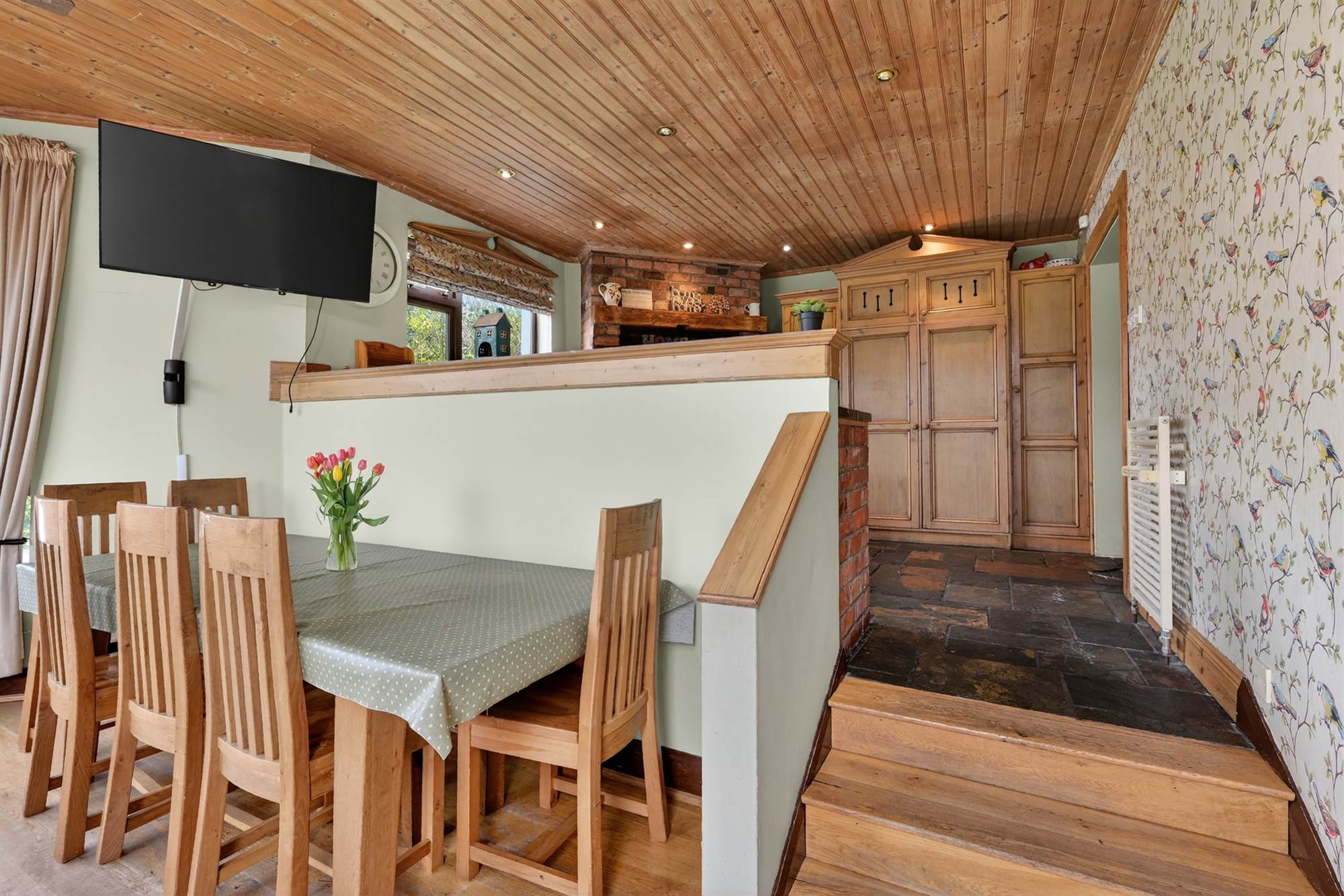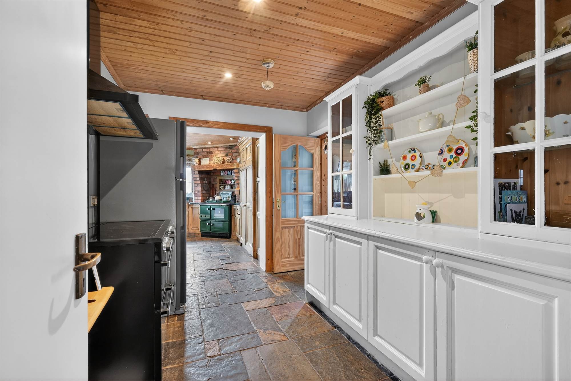 Integrated oven with extractor fan above. Additional built-in cabinets and shelving. Pine tongue and groove ceiling, Chinese slate floor. Square archway through to: