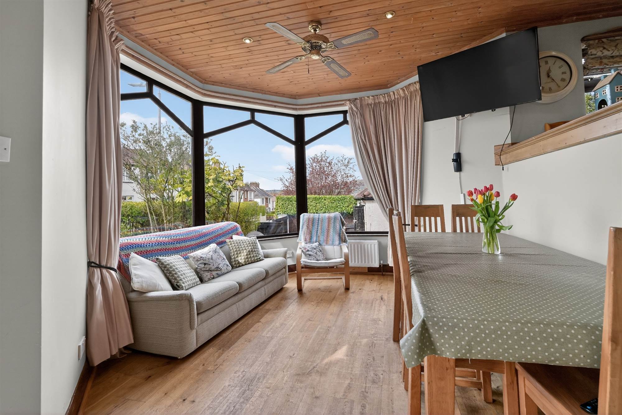 Bright and spacious family room with south-west facing bay window and direct access to patio and garden