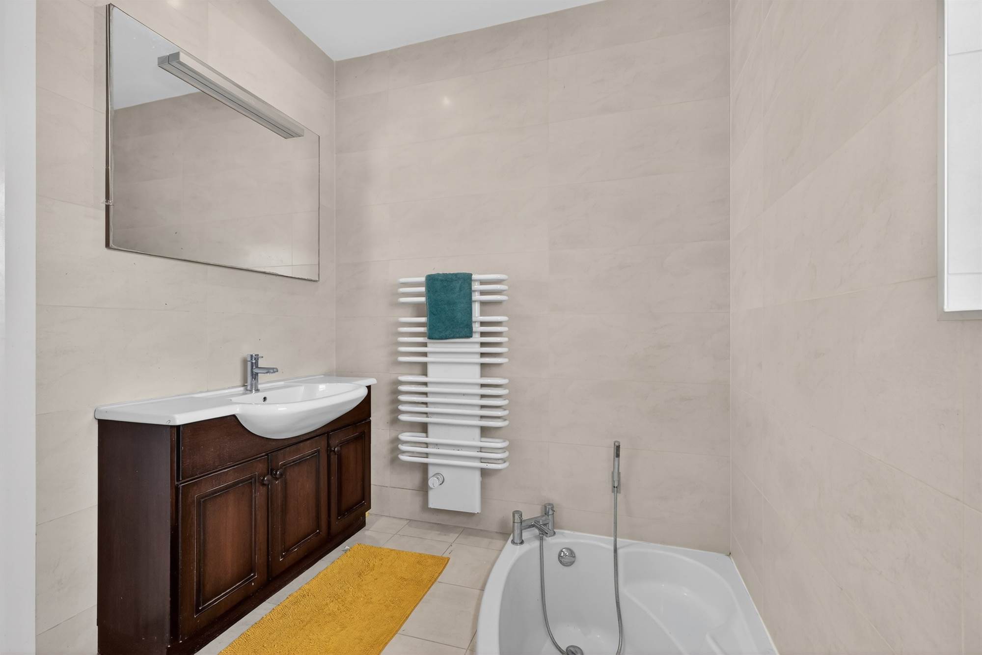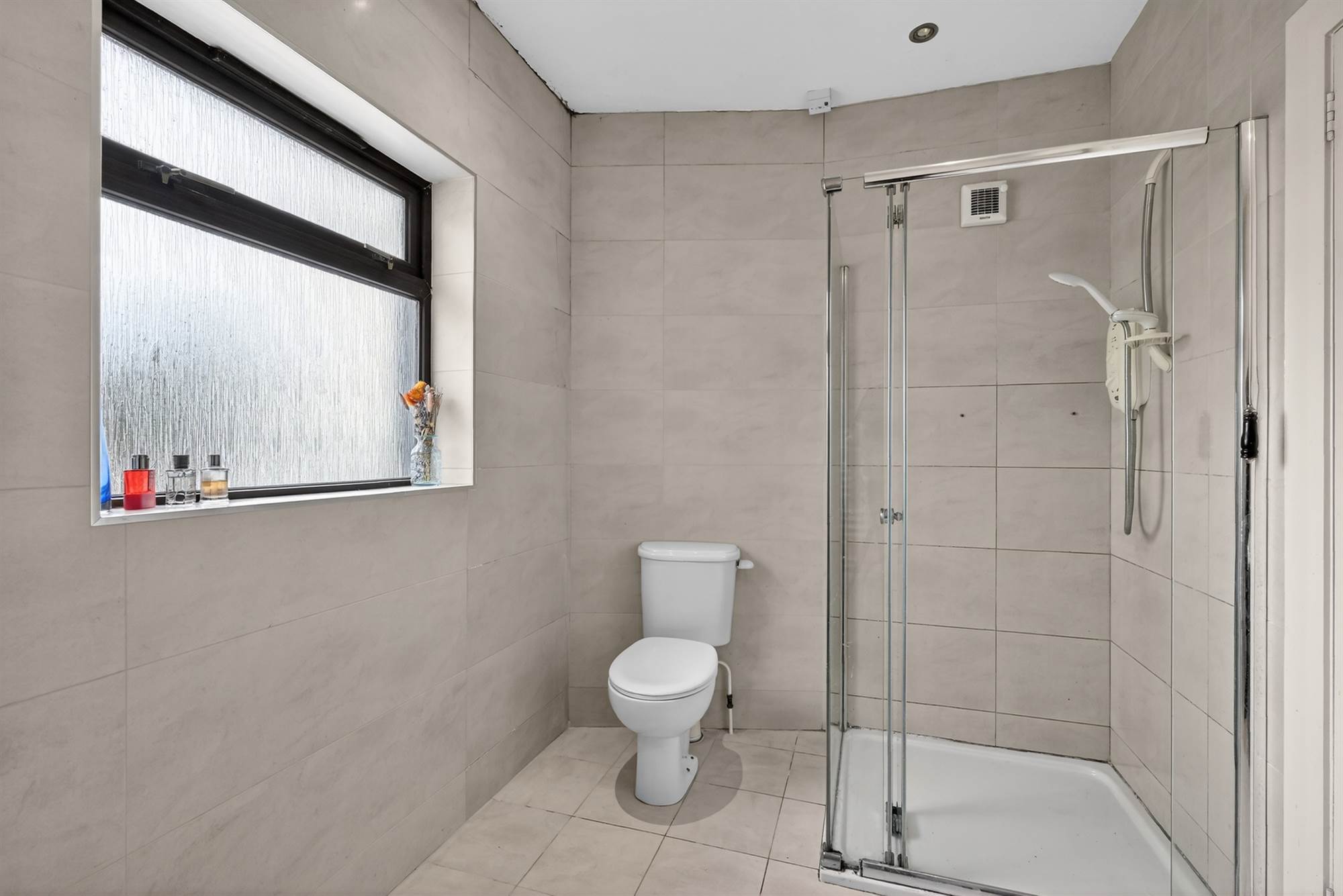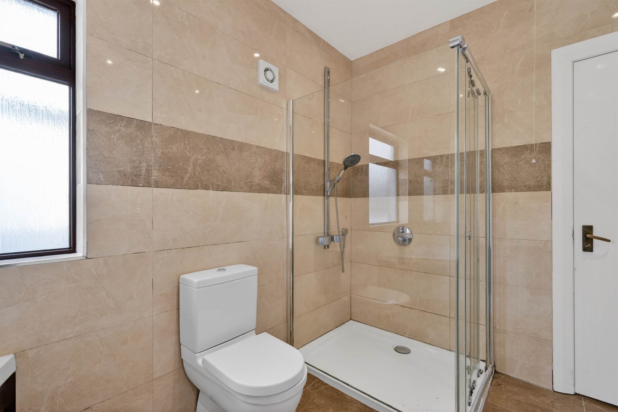 White suite comprising low flush wc, vanity unit with chrome mixer taps, panelled bath with chrome mixer taps, large shower cubicle with chrome shower unit, fully tiled walls, porcelain tiled floor, chrome heated towel rail. Hotpress.