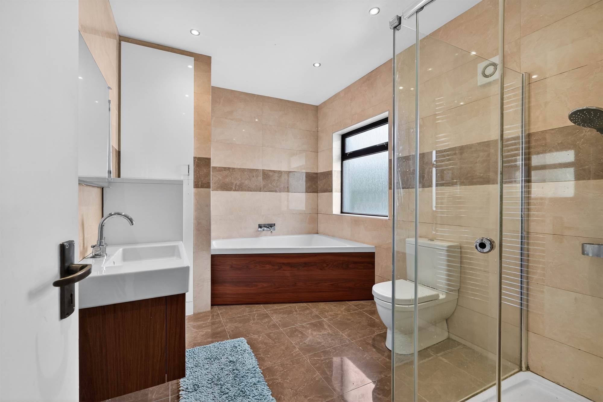 Contemporary family bathroom with quality fittings including corner bath and separate shower