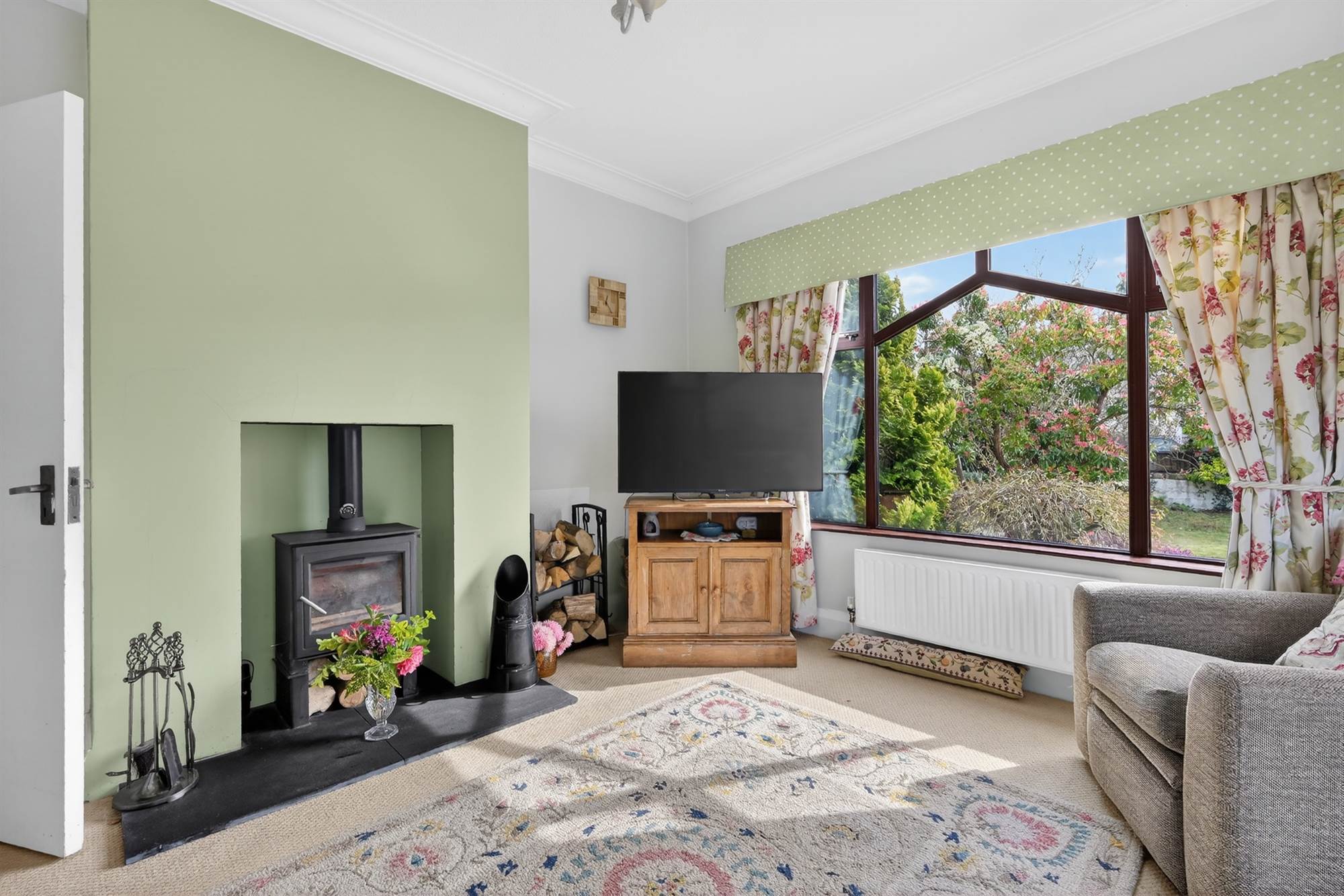 (Measurements into bay window). Dual aspect windows. Mature outlook over front garden. Mourne cast iron wood burning stove, slate hearth. Cornice ceiling.