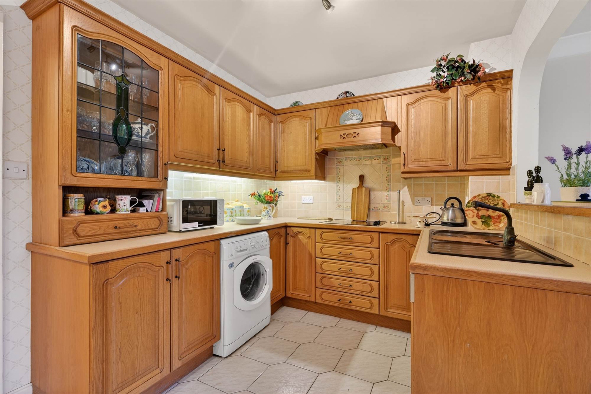 Range of high and low level units, work surfaces, sink and drainer, integrated hob, extractor fan over, plumbed for washing machine, integrated dishwasher, integrated Neff cooker, integrated fridge/freezer, space for microwave, built-in wine rack, part tiled walls, ceramic tiled floor.