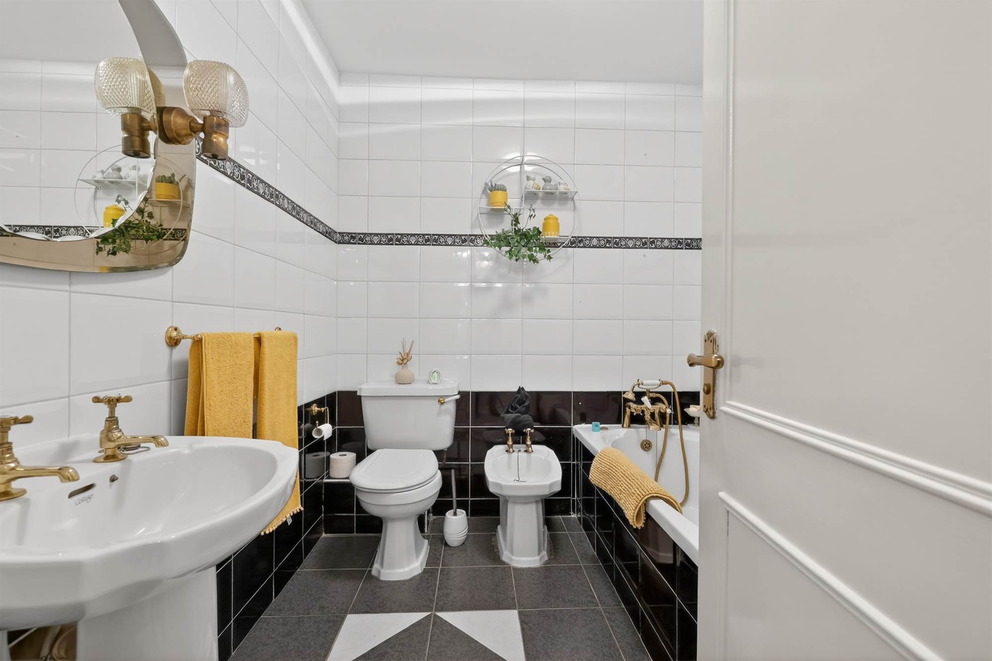 White suite comprising low flush wc, bidet, pedestal wash hand basin, panelled bath with telephone hand shower, fully tiled walls, ceramic tiled floor, extractor fan.