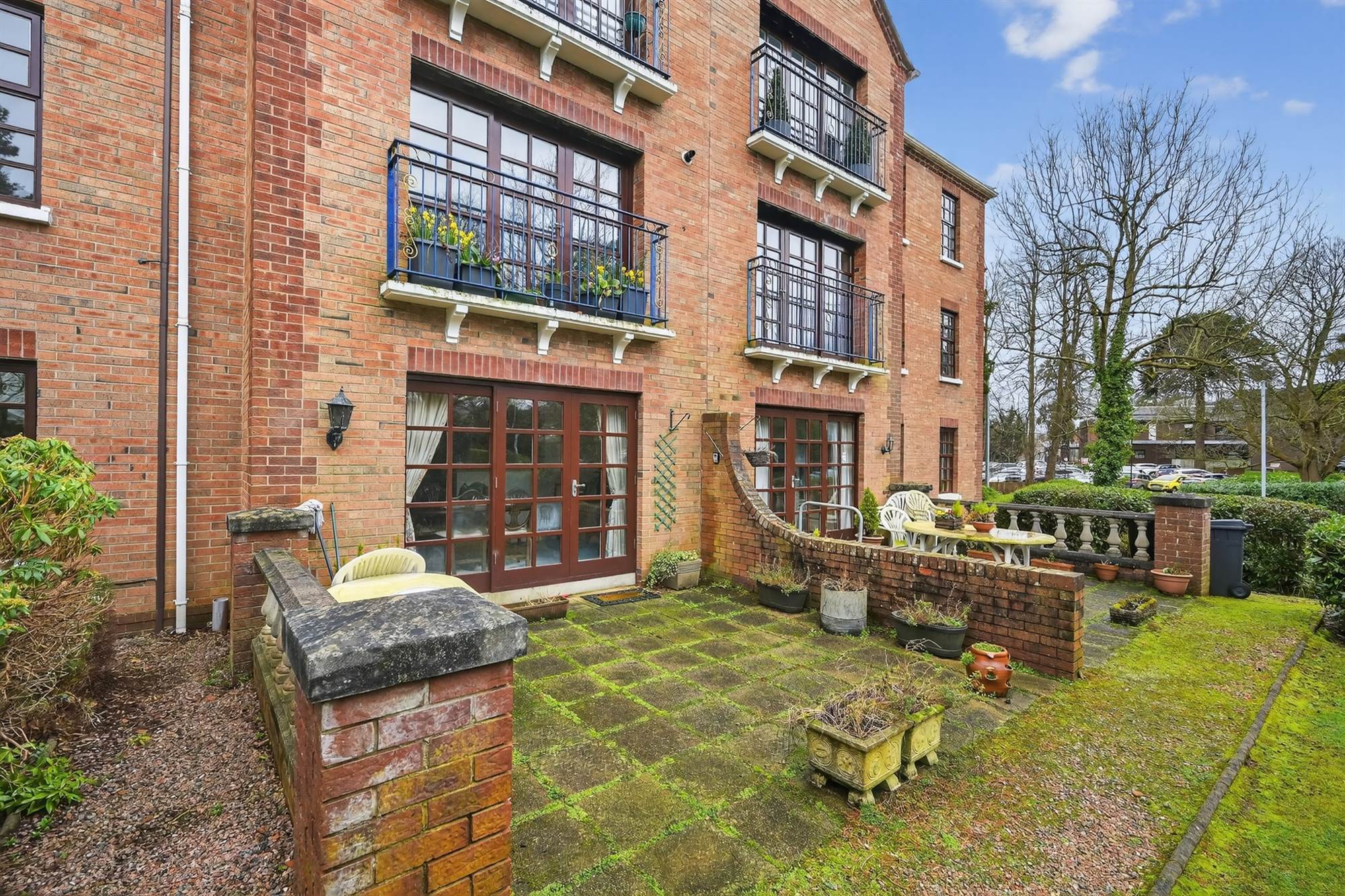 Paved patio garden to the rear and communal lawns and beds in shrubs, trees and bushes.