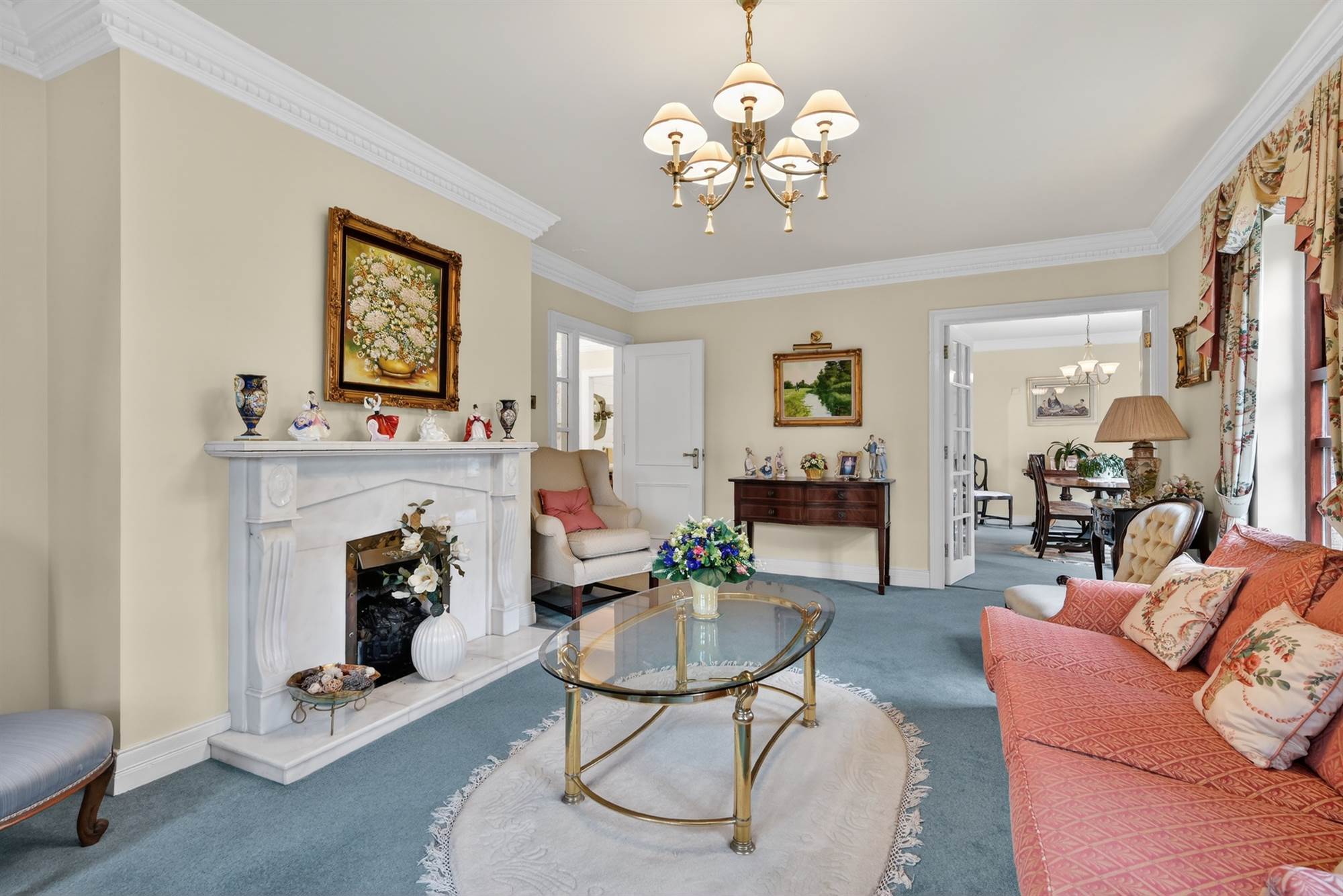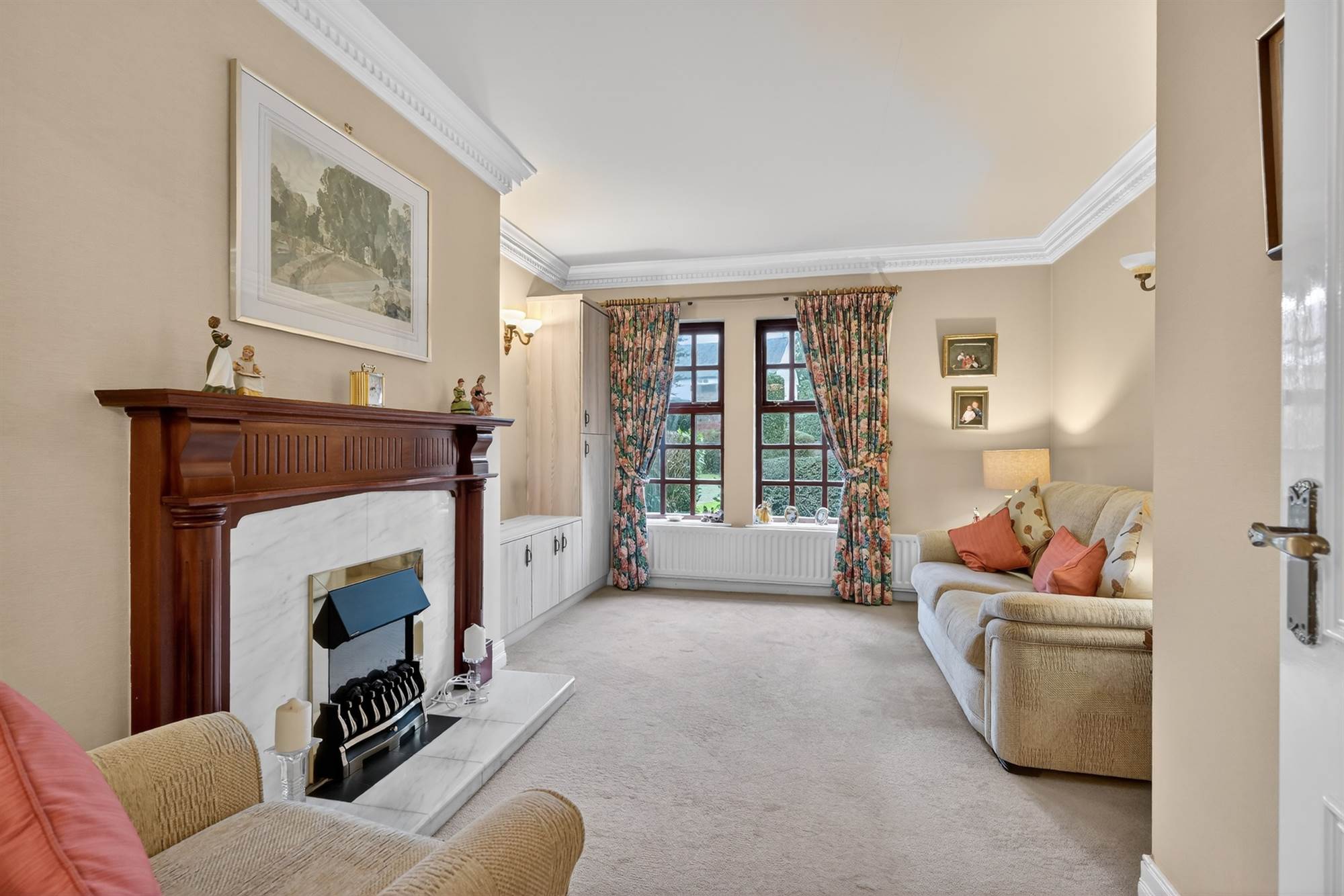 Marble fireplace with gas coal effect fire. Cornice ceiling. Double doors to: