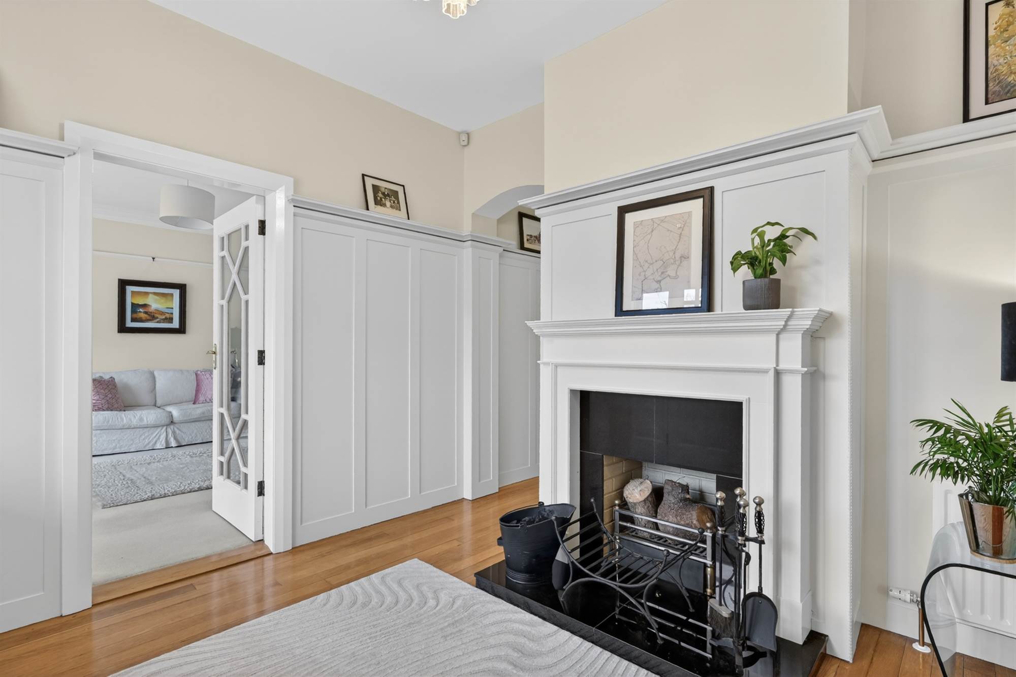 Painted fireplace and granite inset and hearth, wooden floor, painted panelled walls, cloaks area.