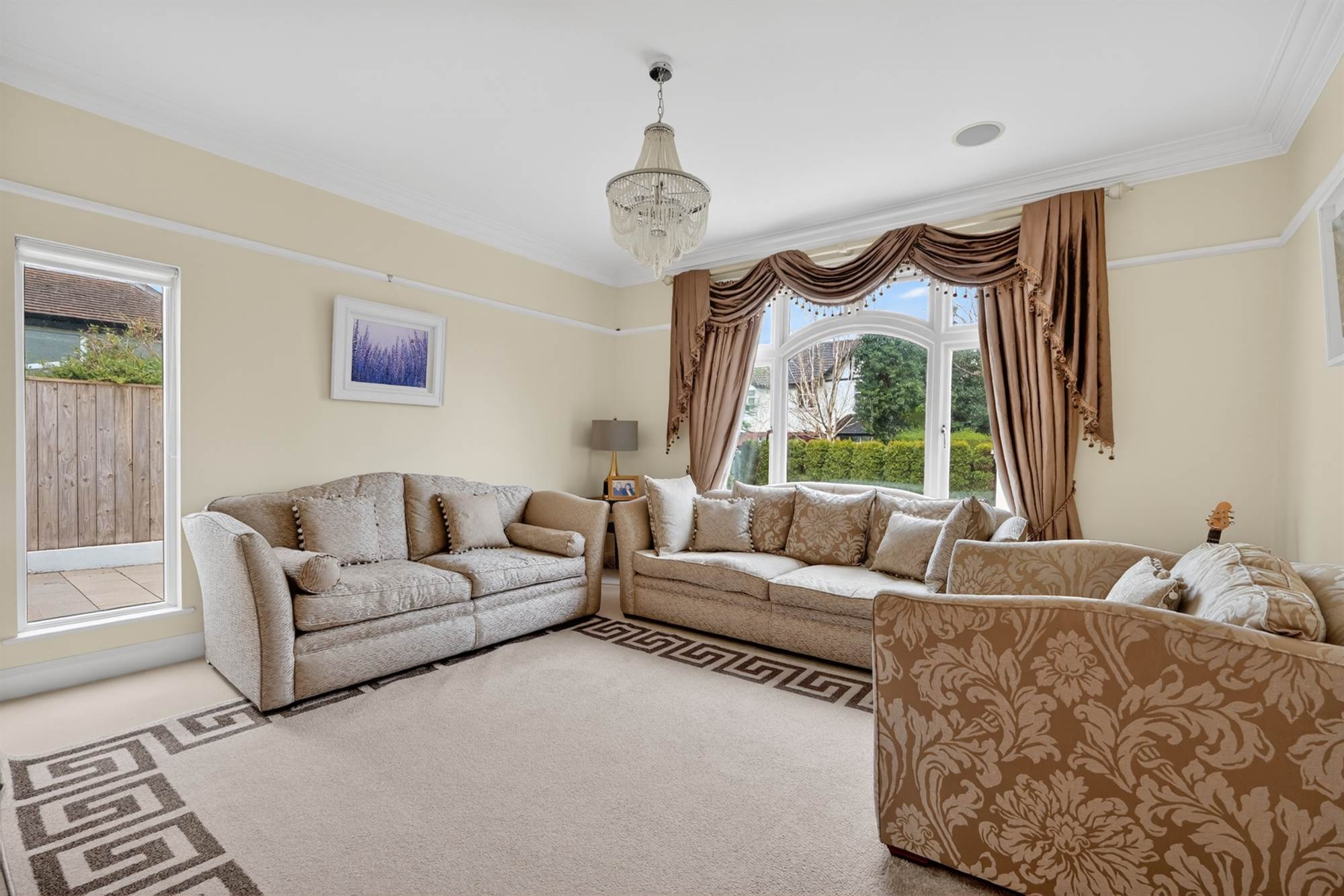 (at widest points). Picture rail, low voltage spotlights, range of built-in wardrobes, surround sound.