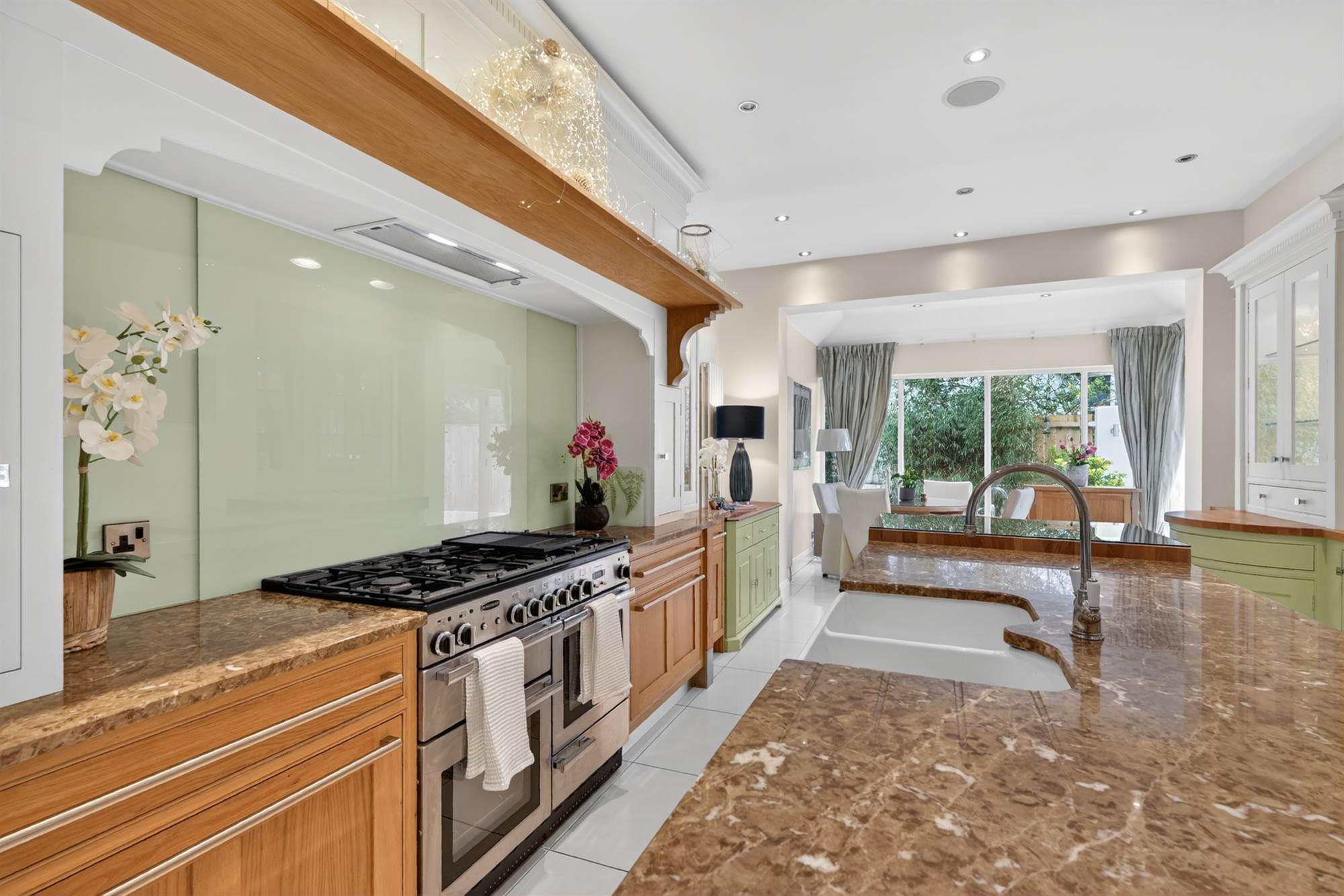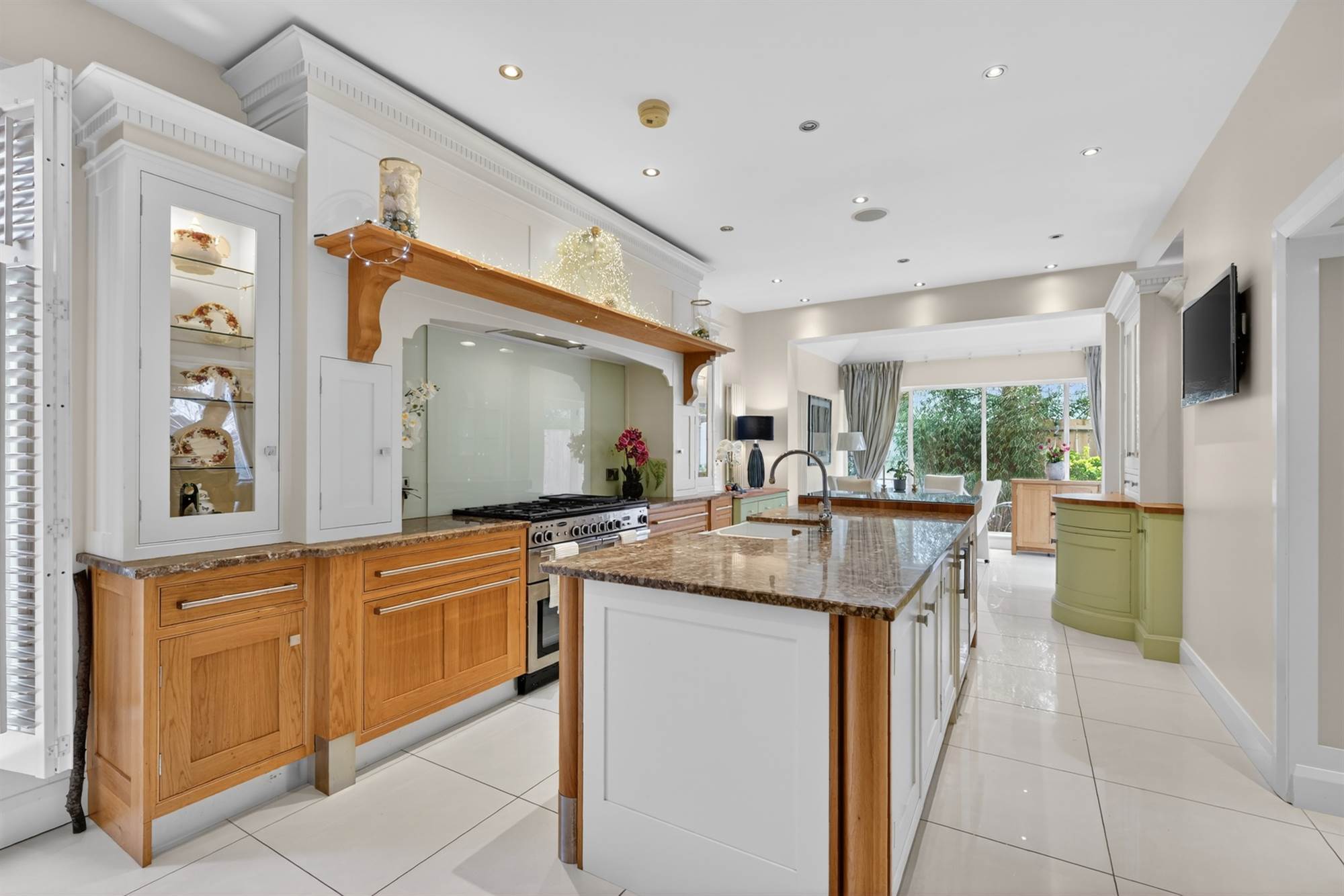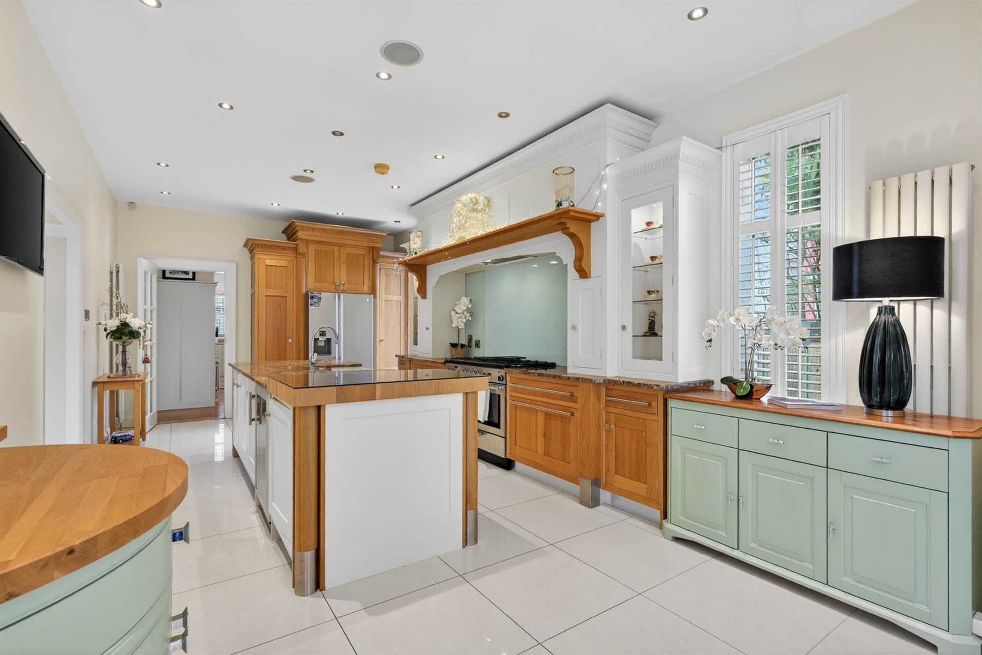(at widest points). Oak hand painted range of high and low level units, granite work surfaces, space for fridge/freezer, range cooker and gas hob, glazed splashback, large island with units, twin old Belfast style sink, granite work surfaces and drainer, breakfast bar with glazed top, space for wine fridge, glazed door to garden, ceramic tiled floor, low voltage spotlights, surround sound, window shutters.