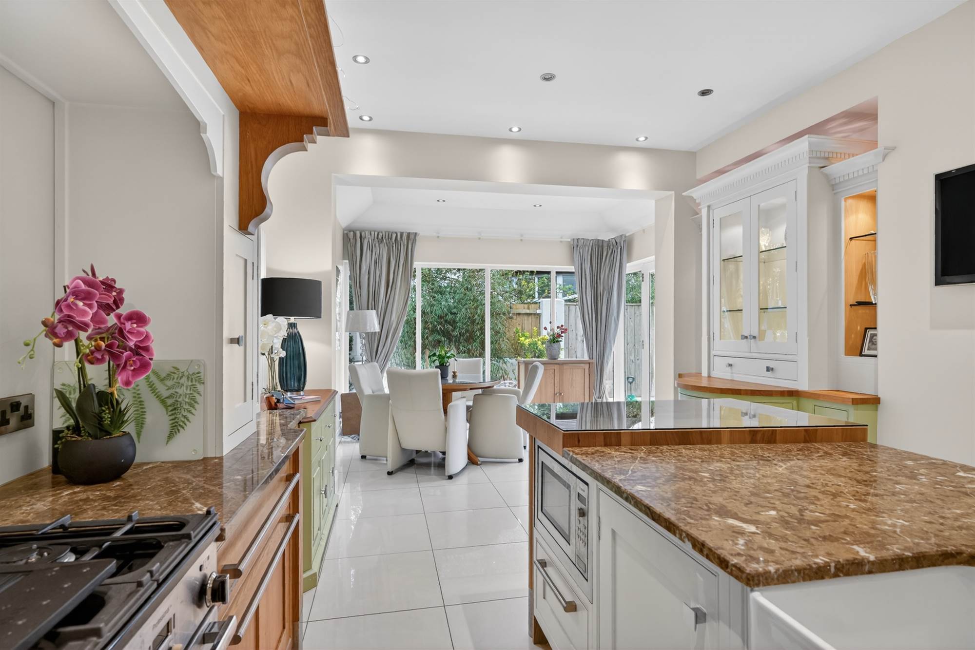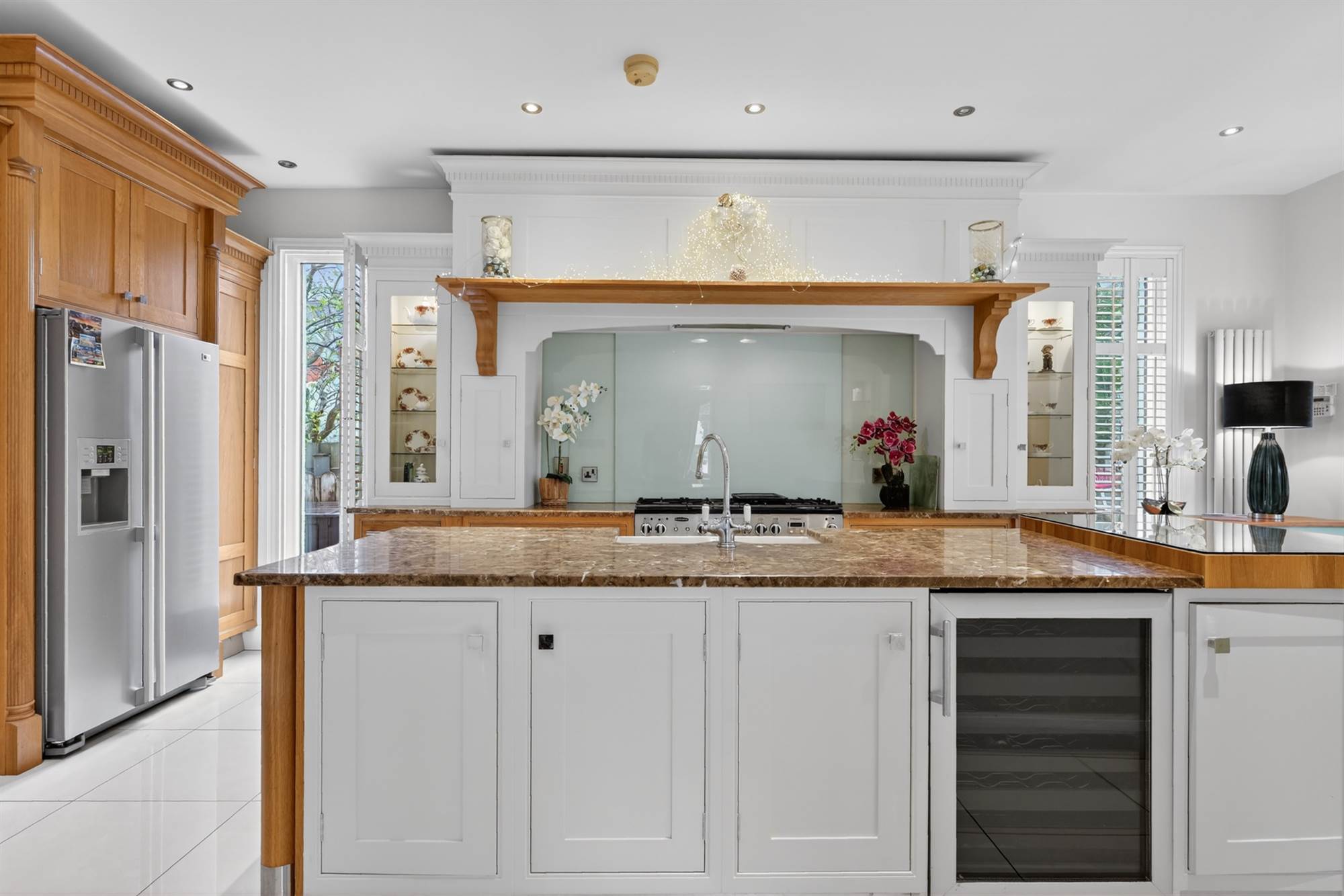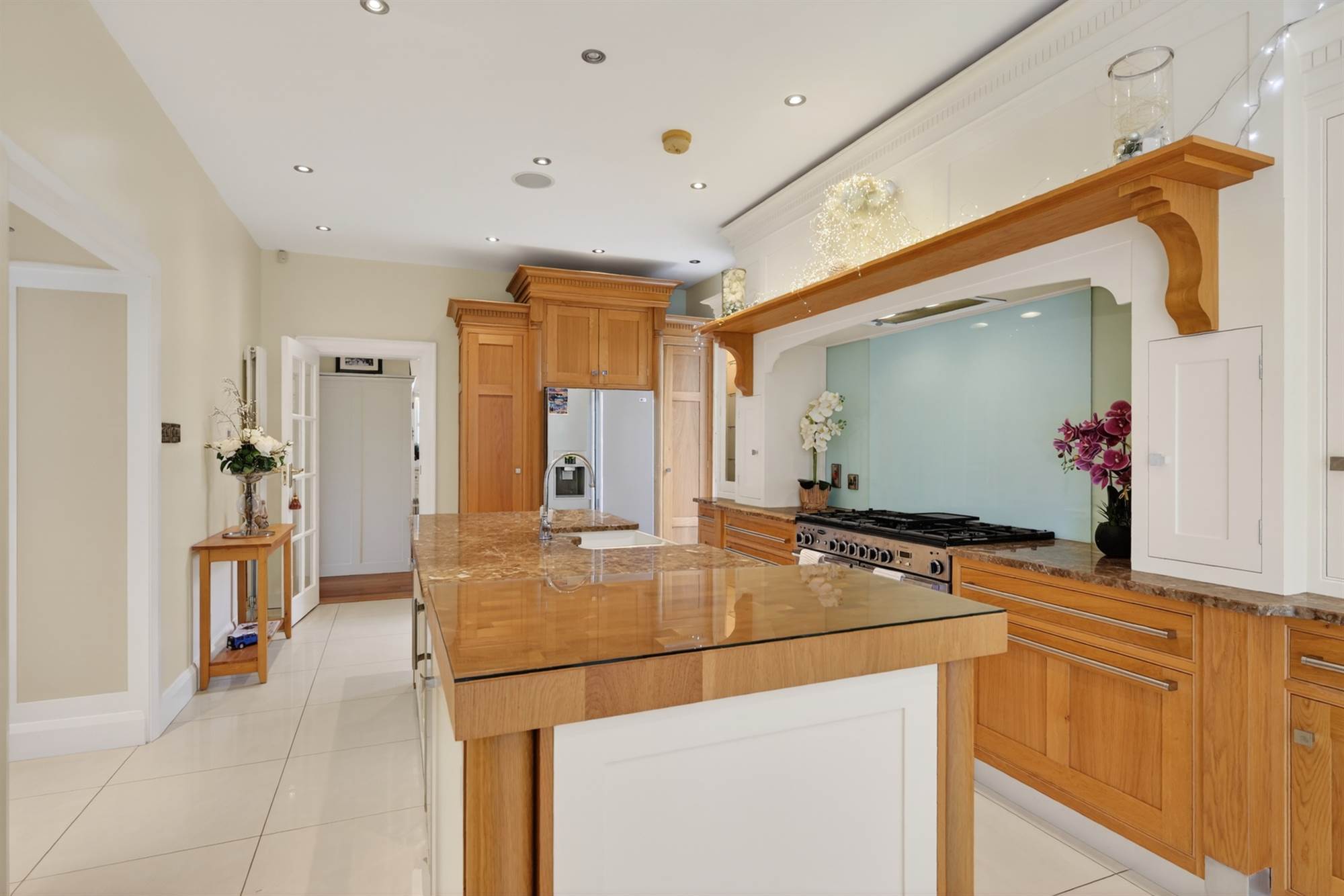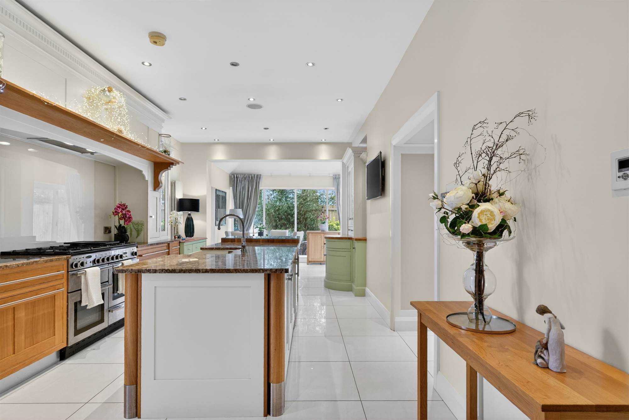 (at widest points). Oak hand painted range of high and low level units, granite work surfaces, space for fridge/freezer, range cooker and gas hob, glazed splashback, large island with units, twin old Belfast style sink, granite work surfaces and drainer, breakfast bar with glazed top, space for wine fridge, glazed door to garden, ceramic tiled floor, low voltage spotlights, surround sound, window shutters.
